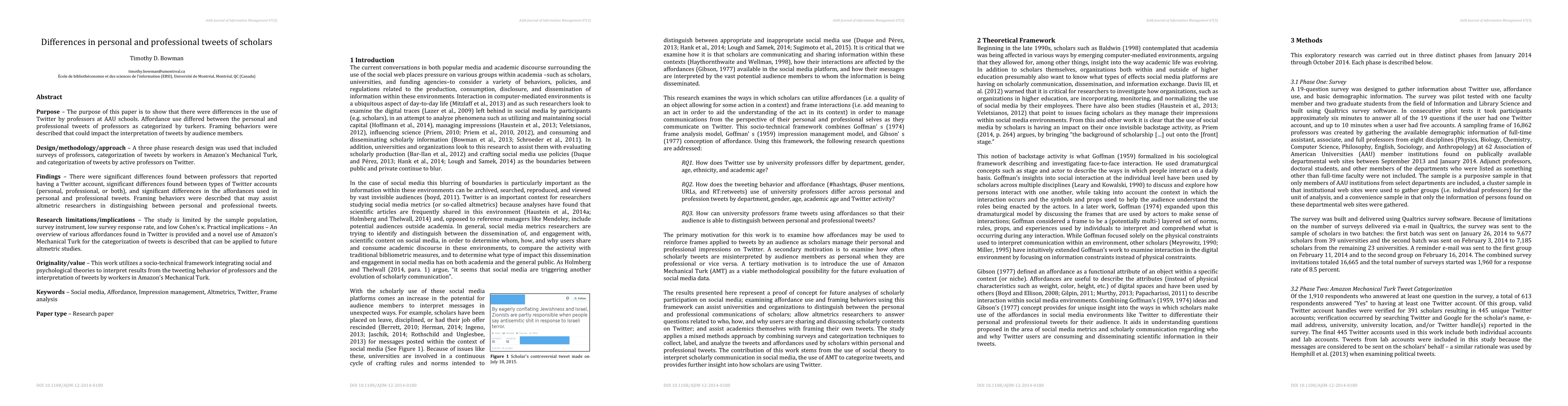 Purpose: This study shows that there were differences in the use of Twitter by professors at universities in the Association of American Universities (AAU). Affordance use differed between the personal and professional tweets of professors. Framing behaviors were described that could impact the interpretation of tweets by audience members. Design/methodology/approach: A three phase research design was used that included surveys of professors, categorization of tweets by Amazon's Mechanical Turk workers (i.e., turkers), and categorization of tweets by active professors on Twitter. Findings: There were significant differences found between professors that reported having a Twitter account, significant differences found between types of Twitter accounts (personal, professional, or both), and significant differences in the affordances used in personal and professional tweets. Framing behaviors were described that may assist altmetric researchers in distinguishing between personal and professional tweets. Research limitations/implications (if applicable): The study is limited by the sample population, survey instrument, low survey response rate, and low Cohen's kappa. Practical implications (if applicable): An overview of various affordances found in Twitter is provided and a novel use of Amazon's Mechanical Turk for the categorization of tweets is described that can be applied to future altmetric studies. Originality/value: This work utilizes a socio-technical framework integrating social and psychological theories to interpret results from the tweeting behavior of professors and the interpretation of tweets by workers in Amazon's Mechanical Turk.