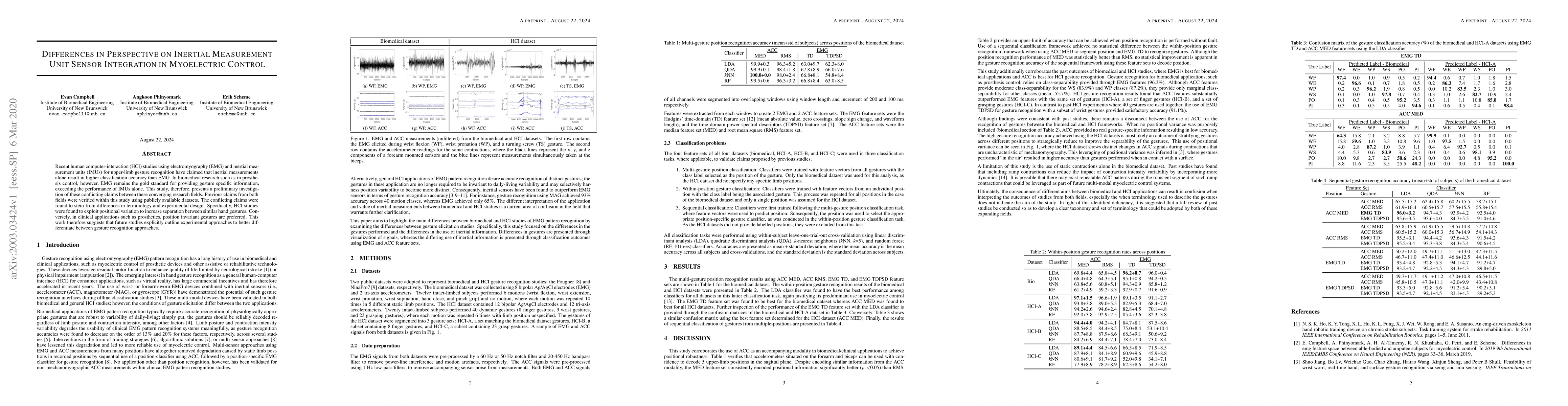 Recent human computer-interaction (HCI) studies using electromyography (EMG) and inertial measurement units (IMUs) for upper-limb gesture recognition have claimed that inertial measurements alone result in higher classification accuracy than EMG. In biomedical research such as in prosthesis control, however, EMG remains the gold standard for providing gesture specific information, exceeding the performance of IMUs alone. This study, therefore, presents a preliminary investigation of these conflicting claims between these converging research fields. Previous claims from both fields were verified within this study using publicly available datasets. The conflicting claims were found to stem from differences in terminology and experimental design. Specifically, HCI studies were found to exploit positional variation to increase separation between similar hand gestures. Conversely, in clinical applications such as prosthetics, position invariant gestures are preferred.This work therefore suggests that future studies explicitly outline experimental approaches to better differentiate between gesture recognition approaches.