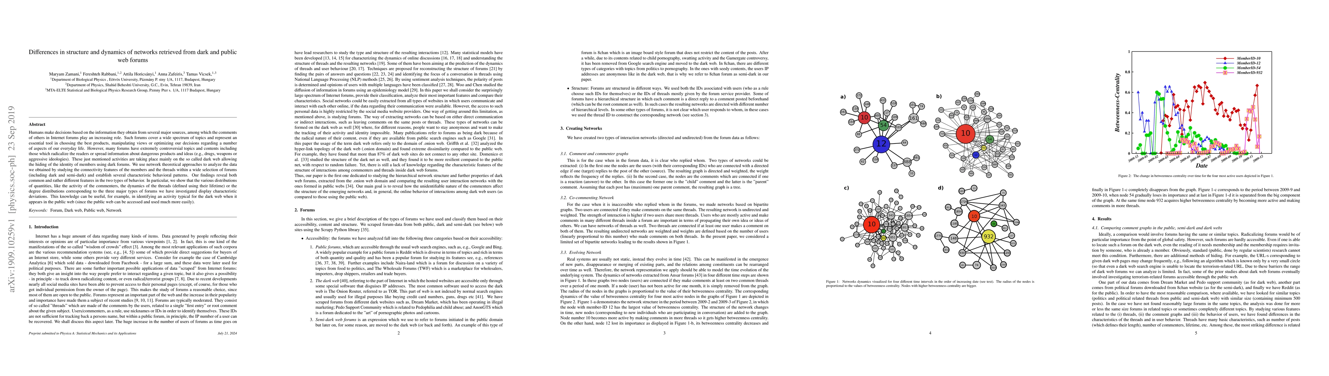 Humans make decisions based on the information they obtain from several major sources, among which the comments of others in Internet forums play an increasing role. Such forums cover a wide spectrum of topics and represent an essential tool in choosing the best products, manipulating views or optimizing our decisions regarding a number of aspects of our everyday life. However, many forums have extremely controversial topics and contents including those which radicalize the readers or spread information about dangerous products and ideas (e.g., drugs, weapons or aggressive ideologies). These just mentioned activities are taking place mainly on the so-called "dark web" allowing the hiding of the identity of members using dark forums. We use network theoretical approaches to analyze the data we obtained by studying the connectivity features of the members and the threads within a wide selection of forums (including dark and semi-dark) and establish several characteristic behavioral patterns. Our findings reveal both common and rather different features in the two types of behavior. In particular, we show that the various distributions of quantities, like the activity of the commenters, the dynamics of the threads (defined using their lifetime) or the degree distributions corresponding to the three major types of forums we have investigated display characteristic deviations. This knowledge can be useful, for example, in identifying an activity typical for the dark web when it appears on the public web (since the public web can be accessed and used much more easily).