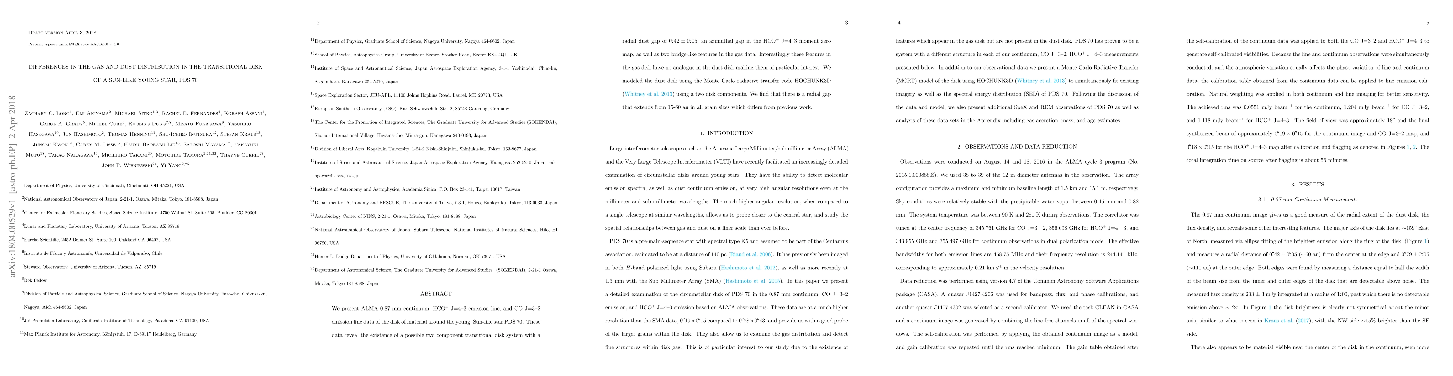 We present ALMA 0.87 mm continuum, HCO+ J=4--3 emission line, and CO J=3--2 emission line data of the disk of material around the young, Sun-like star PDS 70. These data reveal the existence of a possible two component transitional disk system with a radial dust gap of 0."2 +/- 0."05, an azimuthal gap in the HCO+ J=4--3 moment zero map, as well as two bridge-like features in the gas data. Interestingly these features in the gas disk have no analogue in the dust disk making them of particular interest. We modeled the dust disk using the Monte Carlo radiative transfer code HOCHUNK3D (Whitney et al. 2013) using a two disk components. We find that there is a radial gap that extends from 15-60 au in all grain sizes which differs from previous work.