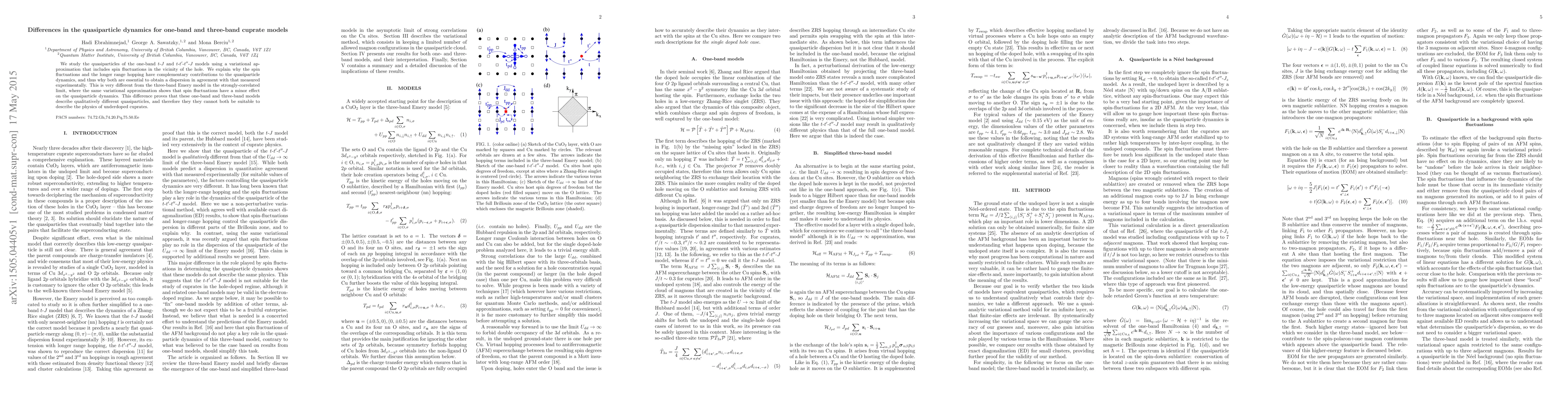 We study the quasiparticles of the one-band $t$-$J$ and $t$-$t'$-$t"$-$J$ models using a variational approximation that includes spin fluctuations in the vicinity of the hole. We explain why the spin fluctuations and the longer range hopping have complementary contributions to the quasiparticle dynamics, and thus why both are essential to obtain a dispersion in agreement with that measured experimentally. This is very different from the three-band Emery model in the strongly-correlated limit, where the same variational approximation shows that spin fluctuations have a minor effect on the quasiparticle dynamics. This difference proves that these one-band and three-band models describe qualitatively different quasiparticles, and therefore they they cannot both be suitable to describe the physics of underdoped cuprates.