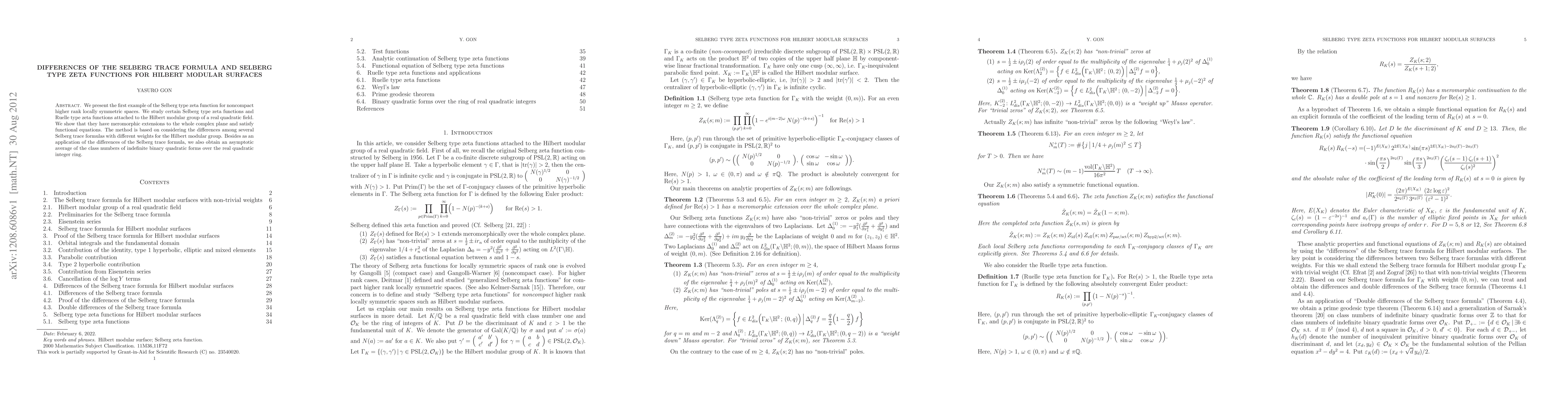 This paper introduces the first Selberg type zeta function for noncompact higher rank spaces, specifically for Hilbert modular surfaces. It demonstrates their meromorphic extensions and functional equations, leveraging differences among various Selberg trace formulas, and applies the findings to derive an asymptotic average of class numbers for binary quadratic forms.