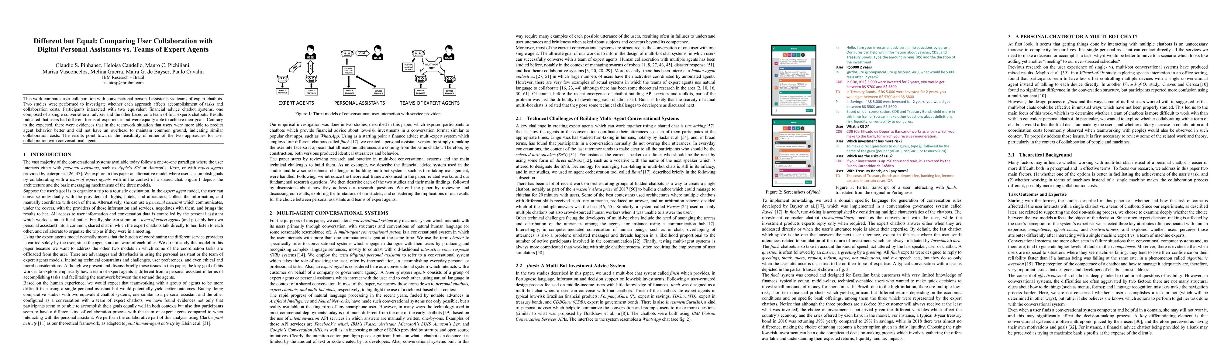 This work compares user collaboration with conversational personal assistants vs. teams of expert chatbots. Two studies were performed to investigate whether each approach affects accomplishment of tasks and collaboration costs. Participants interacted with two equivalent financial advice chatbot systems, one composed of a single conversational adviser and the other based on a team of four experts chatbots. Results indicated that users had different forms of experiences but were equally able to achieve their goals. Contrary to the expected, there were evidences that in the teamwork situation that users were more able to predict agent behavior better and did not have an overhead to maintain common ground, indicating similar collaboration costs. The results point towards the feasibility of either of the two approaches for user collaboration with conversational agents.