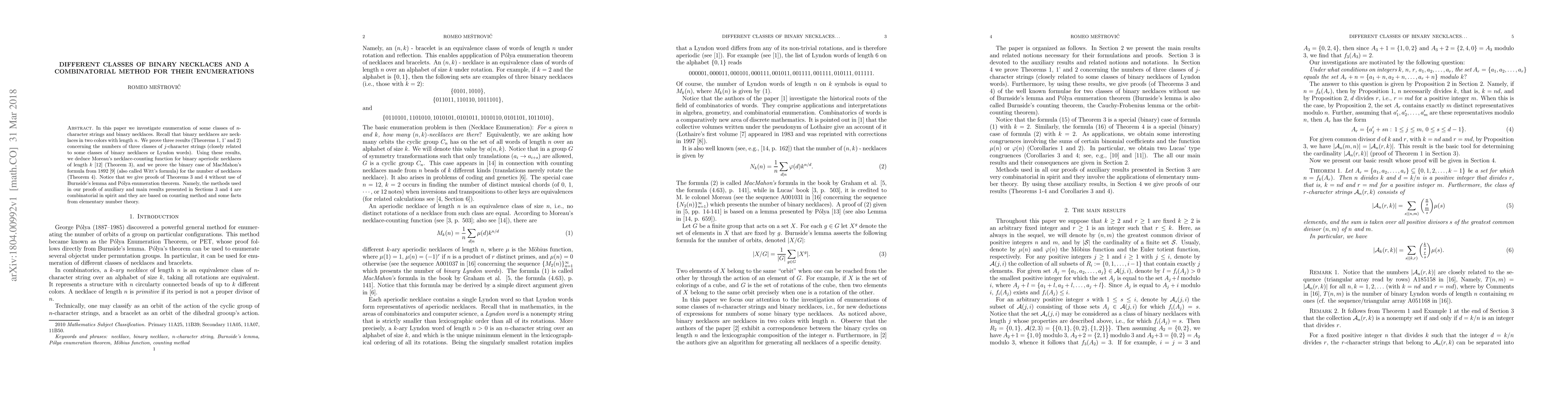 This paper investigates the enumeration of certain classes of binary necklaces and strings using combinatorial methods, leading to new results on necklace counting functions and MacMahon's formula.