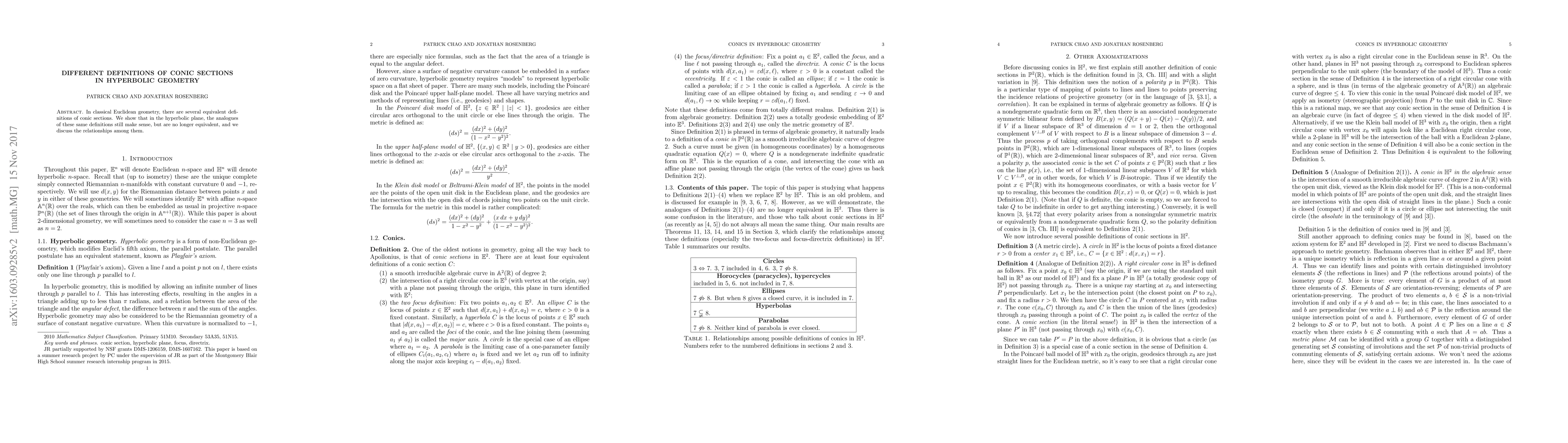 This paper explores how the various definitions of conic sections in Euclidean geometry translate to hyperbolic geometry, revealing that while analogous definitions exist, they are no longer equivalent and discusses their interrelations.