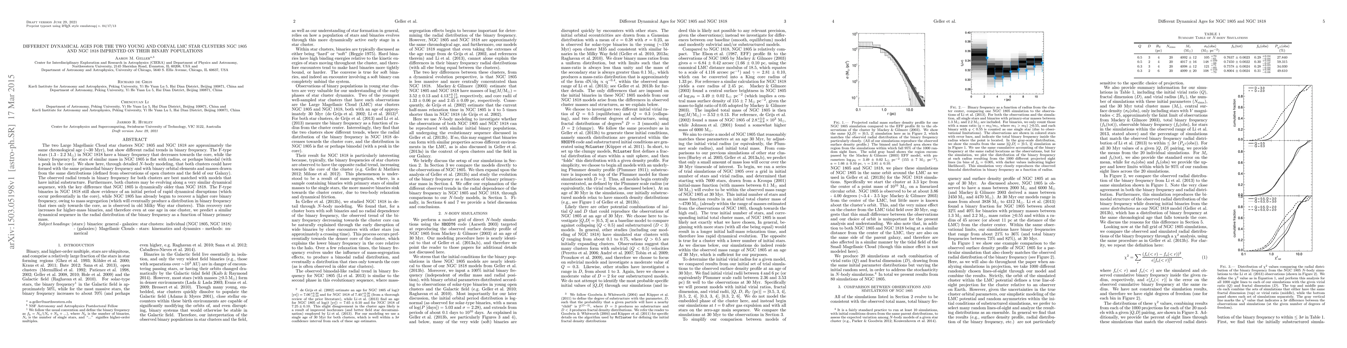 This paper investigates the differing dynamical ages of the coeval LMC star clusters NGC 1805 and NGC 1818, despite their similar chronological ages (~30 Myr), through their binary populations. It finds that while both clusters initially formed with similar binary frequencies, their distinct radial trends in binary frequency are due to differing dynamical evolution, with NGC 1805 appearing dynamically older than NGC 1818.