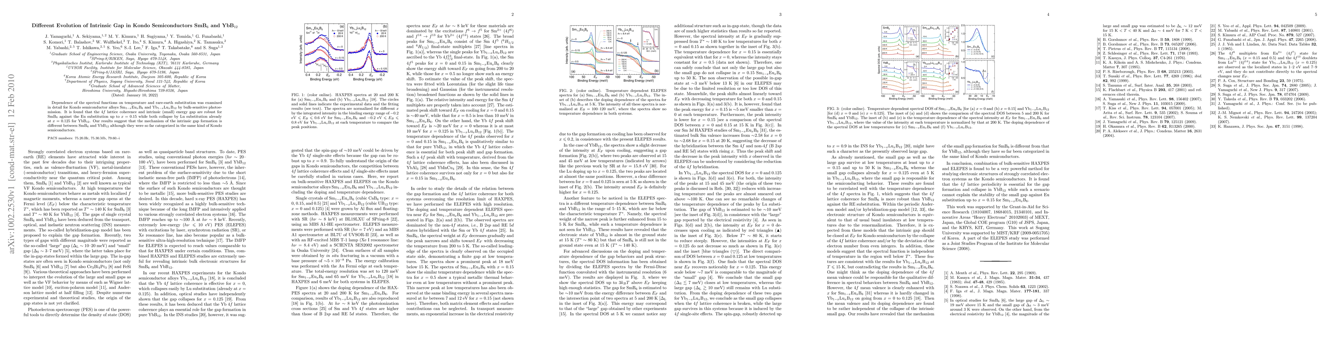This study investigates the temperature and substitution effects on the spectral functions of Kondo semiconductors SmB6 and YbB12 using photoemission. SmB6 maintains its 4f lattice coherence and intrinsic gap against Eu substitution, while YbB12 loses these properties with Lu substitution, indicating different mechanisms for intrinsic gap formation in the two materials.