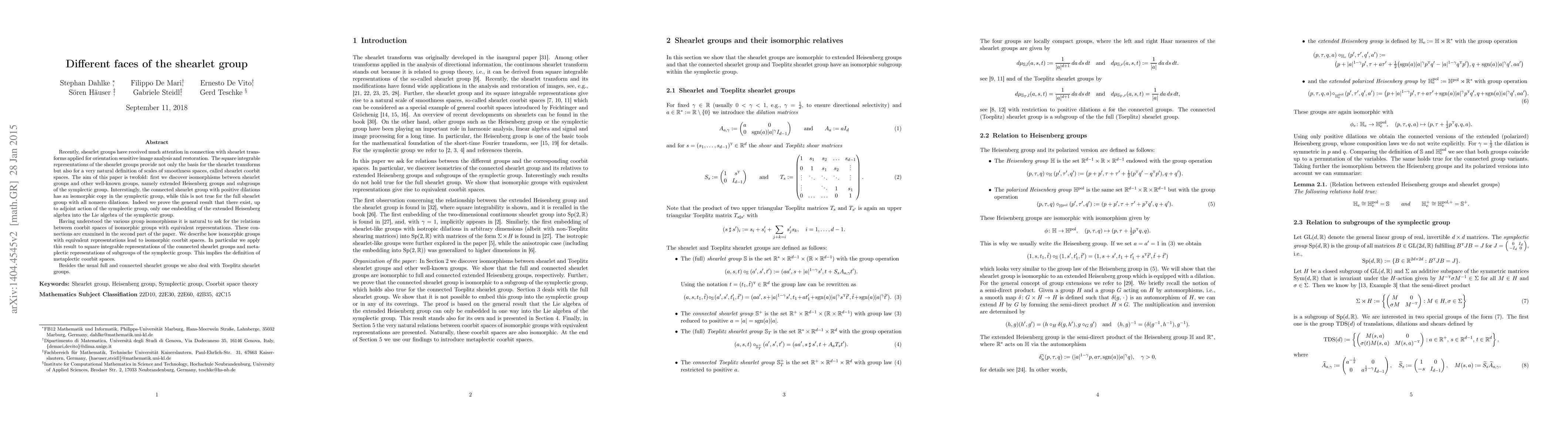 This paper explores the isomorphisms between shearlet groups and other well-known groups, such as the extended Heisenberg groups and subgroups of the symplectic group, revealing unique embeddings. It further investigates the relationships between coorbit spaces of these isomorphic groups, leading to the definition of metaplectic coorbit spaces.