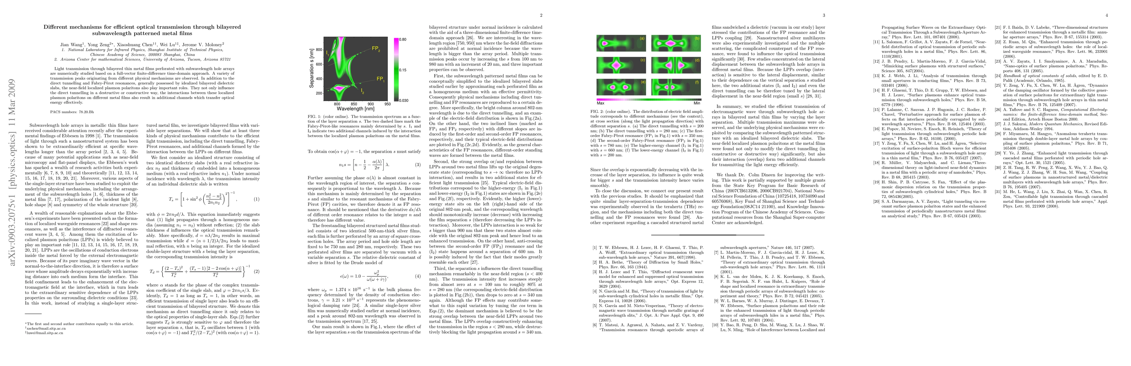 This paper investigates light transmission through bilayered metal films with subwavelength hole arrays using a full-vector finite-difference time-domain approach, revealing multiple transmission peaks from direct tunnelling, Fabry-Pérot resonances, and near-field localized plasmon polaritons, which create additional effective optical energy transfer channels.
