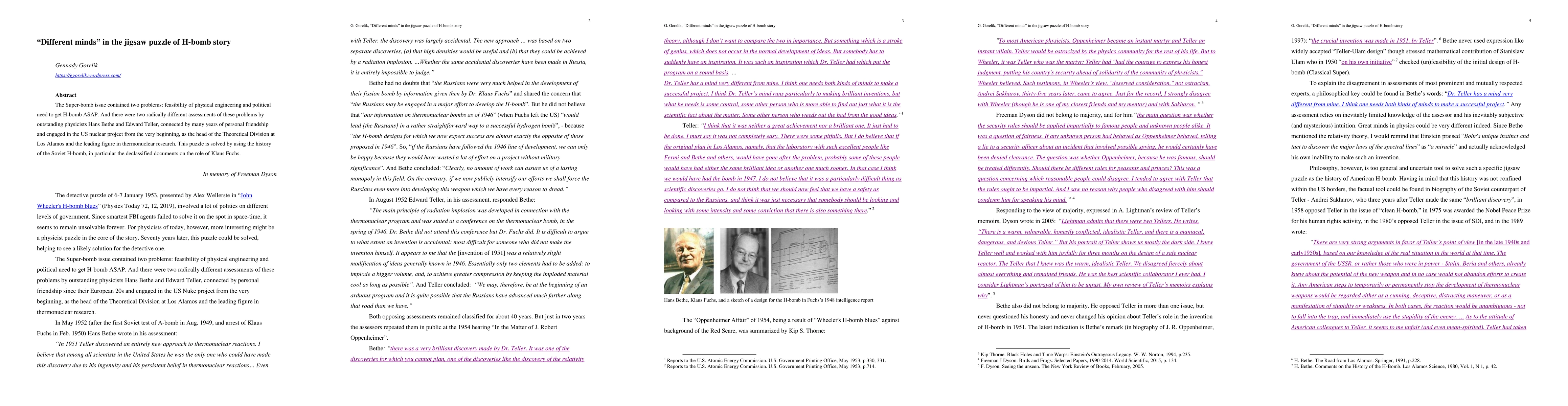 The Super-bomb issue contained two problems: feasibility of physical engineering and political need to get H-bomb ASAP. And there were two radically different assessments of these problems by outstanding physicists Hans Bethe and Edward Teller, connected by many years of personal friendship and engaged in the US nuclear project from the very beginning, as the head of the Theoretical Division at Los Alamos and the leading figure in thermonuclear research. This puzzle is solved by using the history of the Soviet H-bomb, in particular the declassified documents on the role of Klaus Fuchs.