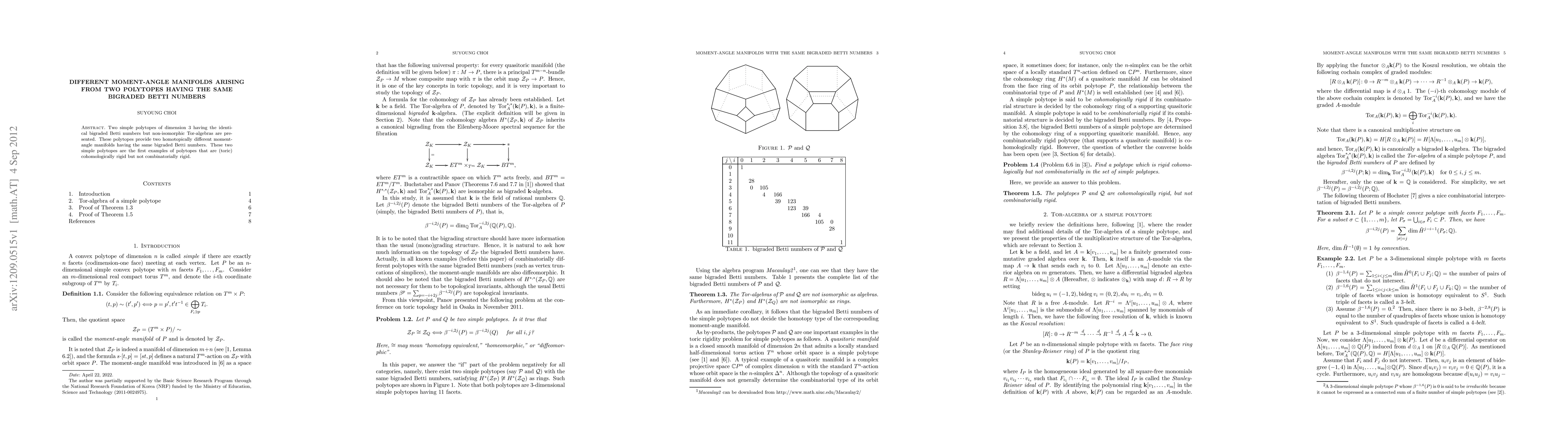 Summary: The paper presents two distinct 3-dimensional simple polytopes with identical bigraded Betti numbers but non-isomorphic Tor-algebras, leading to homotopically different moment-angle manifolds and illustrating the first examples of cohomally rigid yet combinatorially non-rigid polytopes.