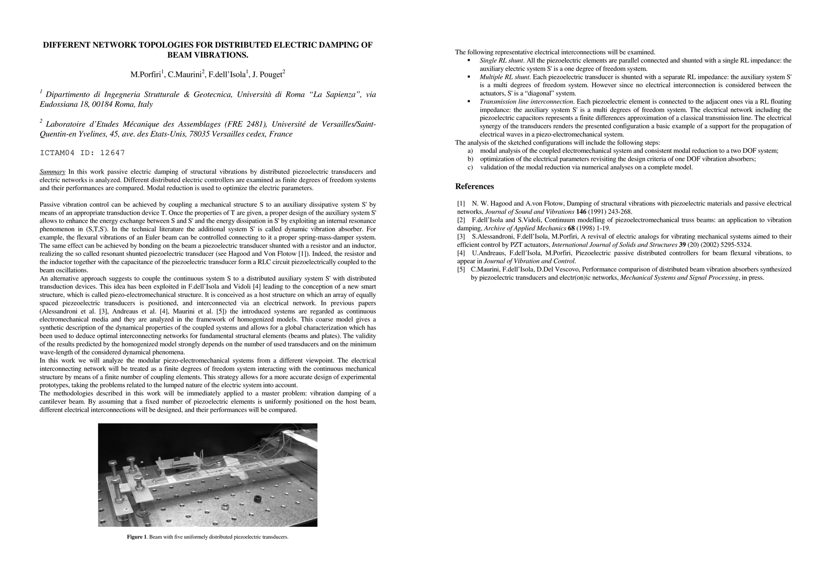 This paper investigates passive electric damping of beam vibrations using distributed piezoelectric transducers and various electric network topologies. It compares the performance of different electric controllers through modal reduction to optimize electric parameters.