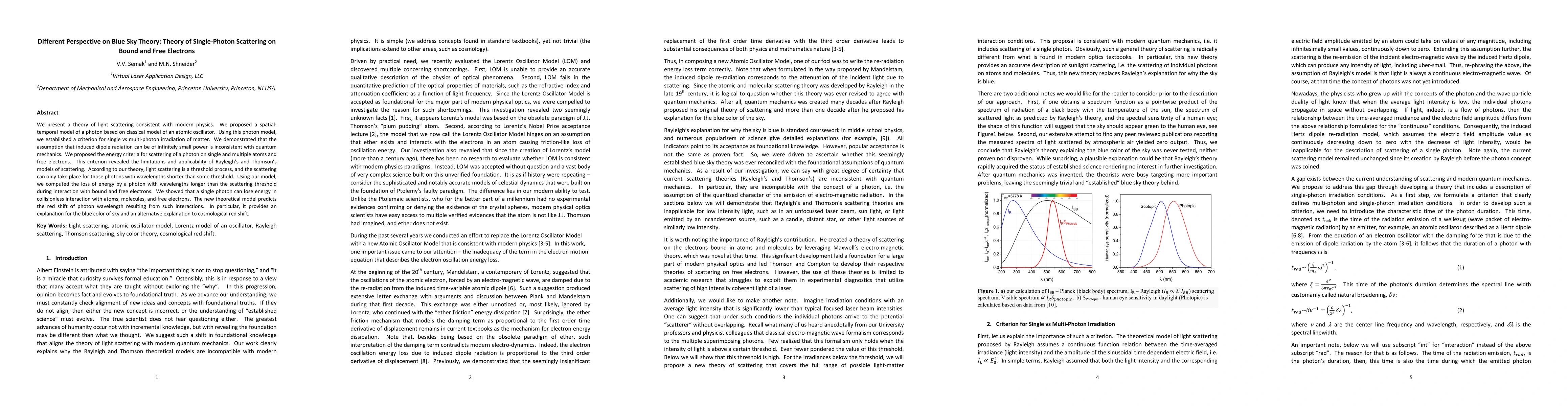 This paper proposes a new theoretical model for light scattering based on a spatial-temporal photon model and classical atomic oscillators, demonstrating that light scattering is a threshold process dependent on photon wavelength. It provides an alternative explanation for the blue sky and cosmological red shift, showing that single photons can lose energy in interactions with electrons, leading to wavelength shifts.