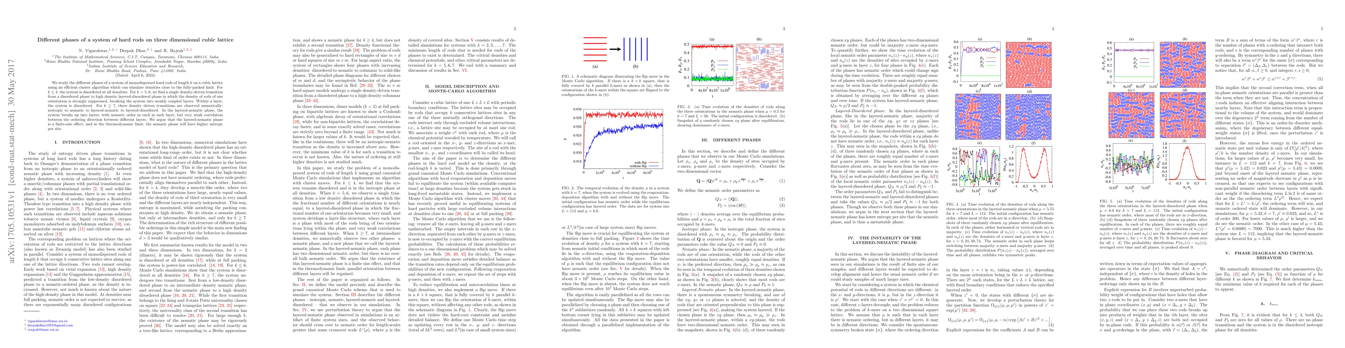 This paper investigates the phase transitions in a system of hard rods on a cubic lattice, revealing distinct phases for different rod lengths. For rods of length $k \leq 4$, the system remains disordered; for $k=5,6$, a transition to a layered-disordered phase occurs; for $k \geq 7$, transitions from isotropic to nematic to layered-nematic to layered-disordered phases are observed.