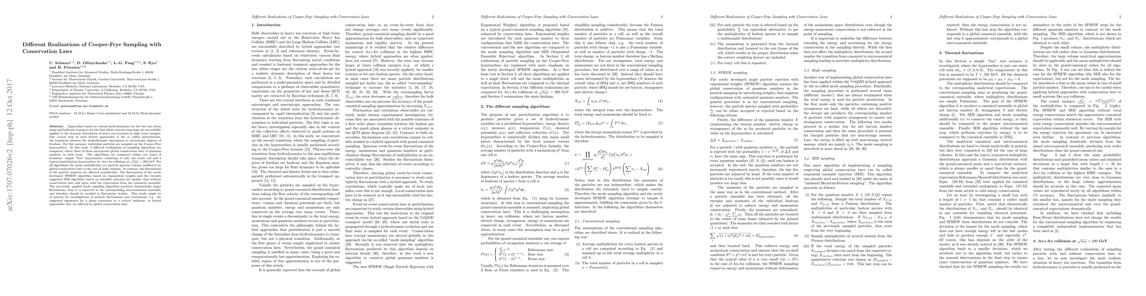 This paper compares four different Cooper-Frye sampling algorithms for particle production in heavy ion collisions, focusing on how global conservation laws affect particle number fluctuations. The results show that two new algorithms, SPREW and SER, yield smaller fluctuations and better agreement with canonical ensemble expectations, while the mode sampling algorithm produces larger fluctuations, making it unsuitable for fluctuation studies.