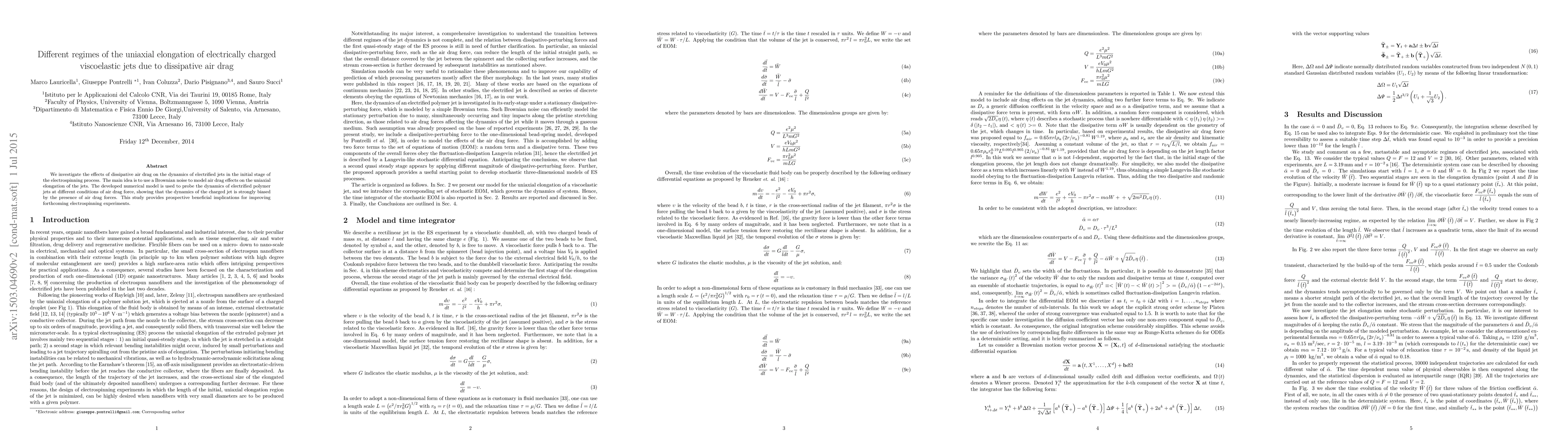 This paper examines how dissipative air drag influences the uniaxial elongation of electrically charged viscoelastic jets during electrospinning, using Brownian noise to model air drag. The study reveals that air drag significantly affects the dynamics of the charged jets, offering insights to enhance future electrospinning experiments.