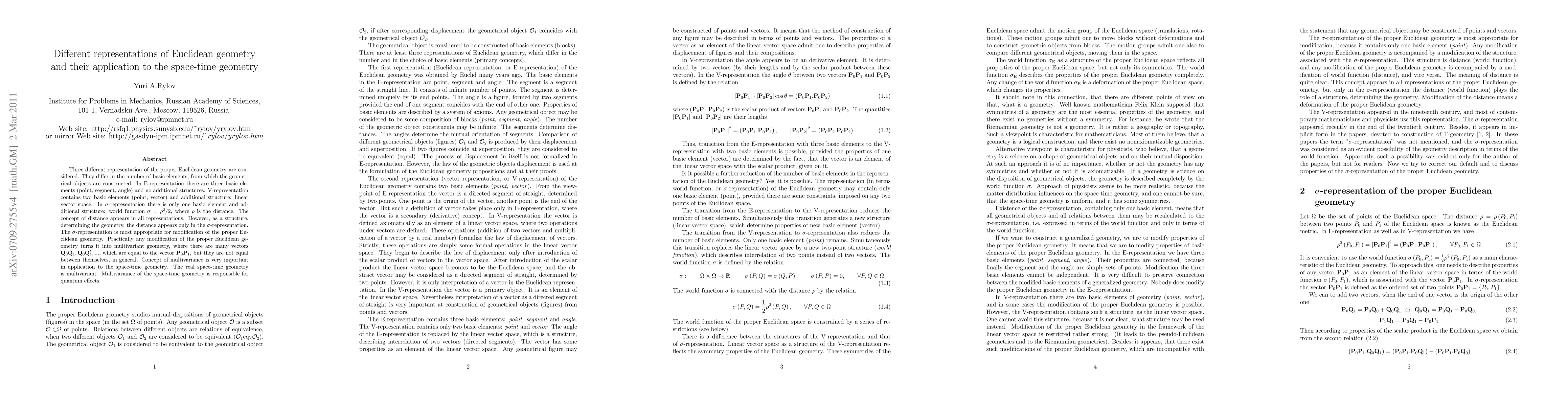 Three different representation of the proper Euclidean geometry are considered. They differ in the number of basic elements, from which the geometrical objects are constructed. In E-representation there are three basic elements (point, segment, angle) and no additional structures. V-representation contains two basic elements (point, vector) and additional structure: linear vector space. In sigma-representation there is only one basic element and additional structure: world function \sigma =\rho^{2}/2, where \rho is the distance. The concept of distance appears in all representations. However, as a structure, determining the geometry, the distance appears only in the sigma-representation. The sigma-representation is most appropriate for modification of the proper Euclidean geometry. Practically any modification of the proper Euclidean geometry turns it into multivariant geometry, where there are many vectors Q_0Q_1, Q_0Q_1^{\prime},..., which are equal to the vector P_0P_1, but they are not equal between themselves, in general. Concept of multivariance is very important in application to the space-time geometry. The real space-time geometry is multivariant. Multivariance of the space-time geometry is responsible for quantum effects.