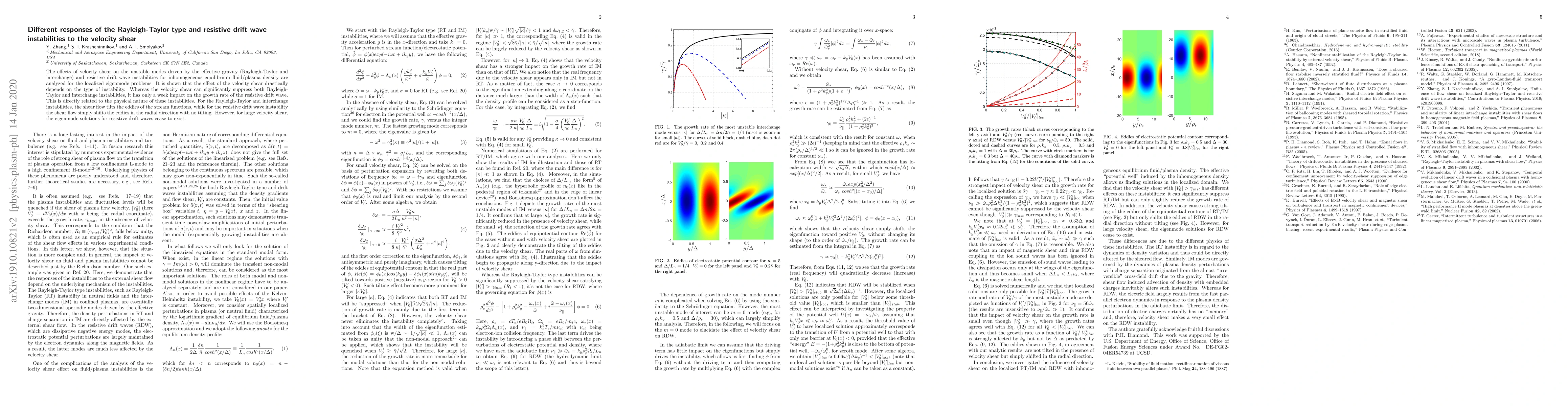 This paper analyzes the impact of velocity shear on Rayleigh-Taylor and resistive drift wave instabilities in fluid/plasma density gradients. Velocity shear significantly suppresses Rayleigh-Taylor and interchange instabilities but has a minimal effect on resistive drift waves, due to differing physical mechanisms of eddy tilting versus radial shifting.