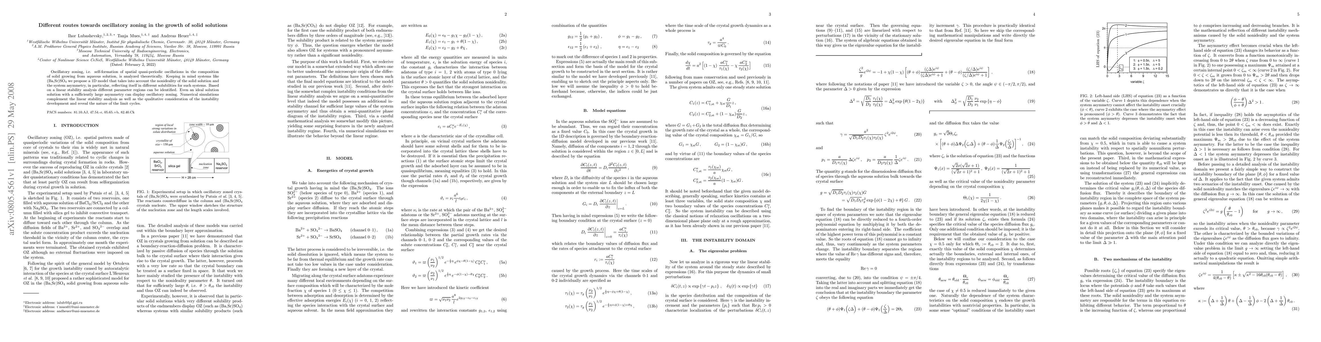 Oscillatory zoning, i.e. self-formation of spatial quasi-periodic oscillations in the composition of solid growing from aqueous solution, is analyzed theoretically. Keeping in mind systems like (Ba,Sr)SO4 we propose a 1D model that takes into account the nonideality of the solid solution and the system asymmetry, in particular, reflecting itself in different solubilities for such systems. Based on a linear stability analysis different parameter regions can be identified. Even an ideal solution solution with a sufficiently large asymmetry can display oscillatory zoning. Numerical simulations complement the linear stability analysis as well as the qualitative consideration of the instability development and reveal the nature of the limit cycles.