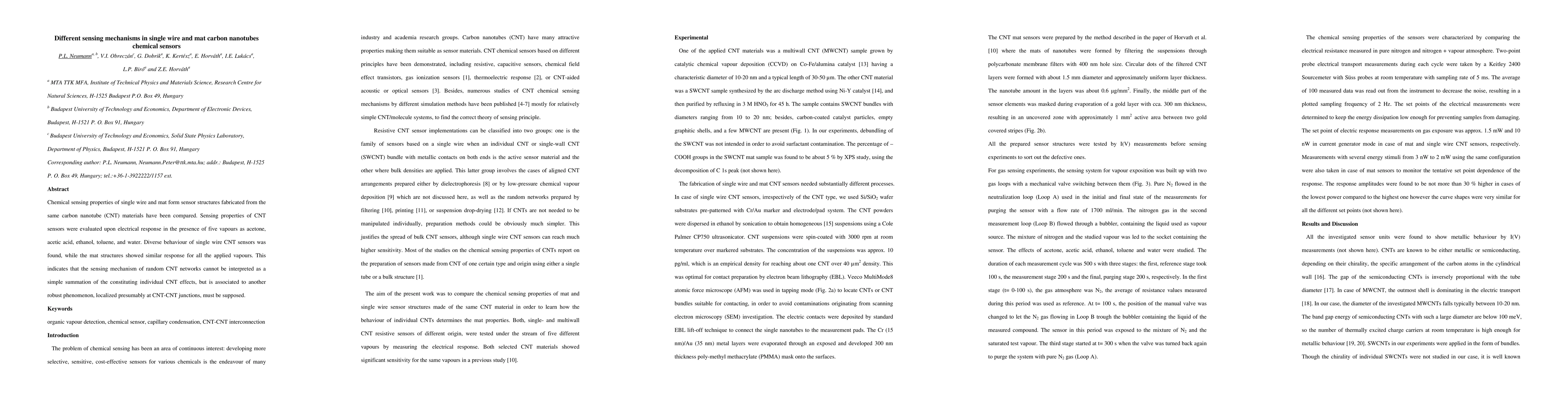 Single wire CNT sensors showed diverse behavior towards vapors, while mat structures displayed similar responses to all applied vapors, indicating a unique sensing mechanism at CNT-CNT junctions.