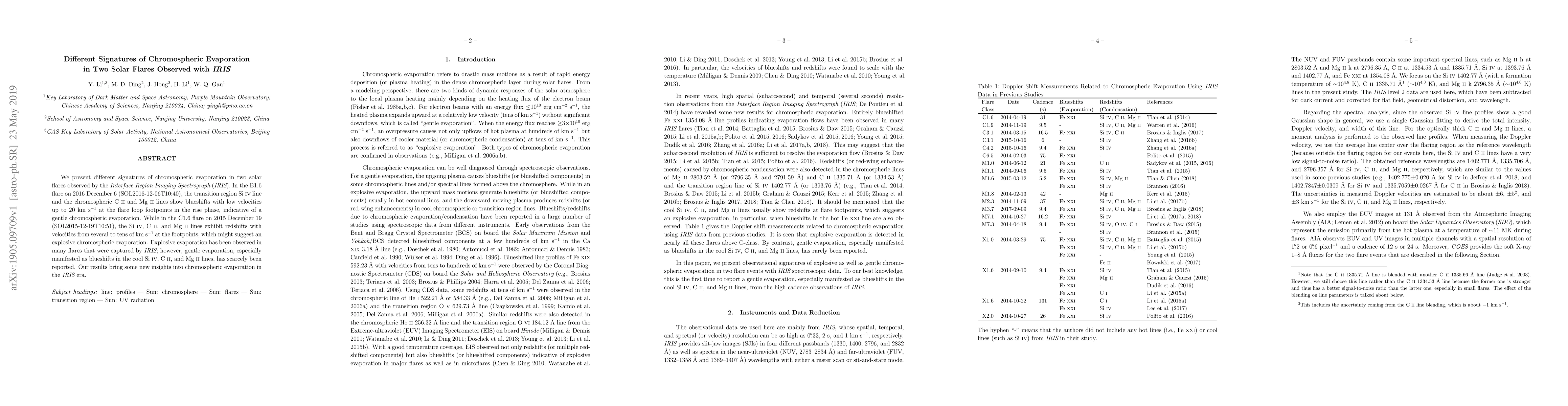 This paper examines chromospheric evaporation in two solar flares observed by IRIS, finding different evaporation signatures: gentle evaporation with blueshifts in the B1.6 flare and explosive evaporation with redshifts in the C1.6 flare, offering new insights into the phenomenon.