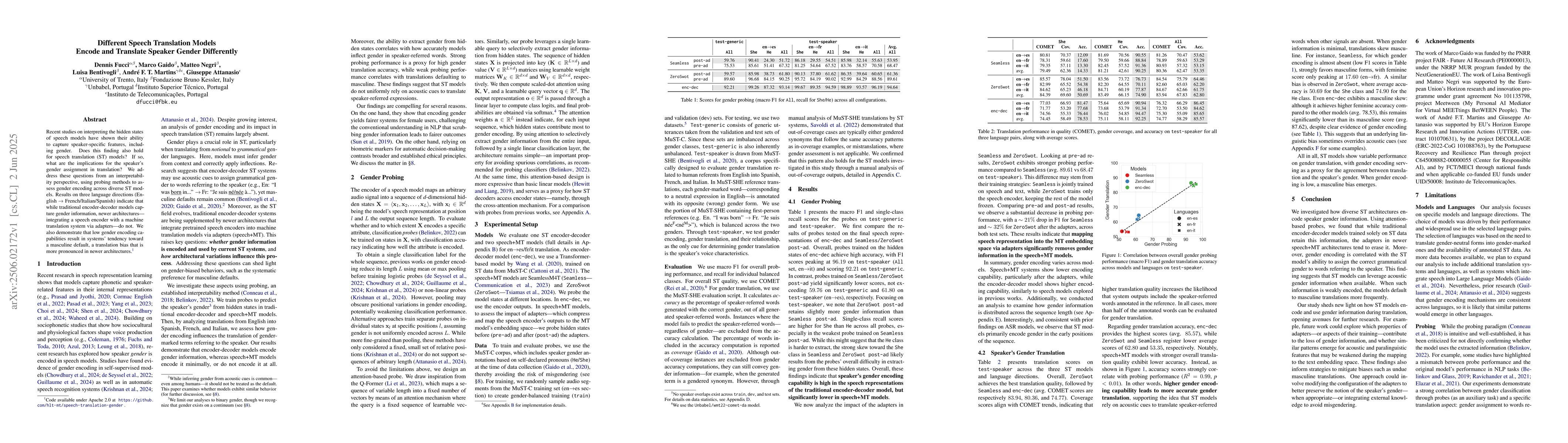 Speech translation models capture speaker gender information differently, with traditional models encoding it well but newer architectures failing to do so. This results in a masculine default bias in translations.