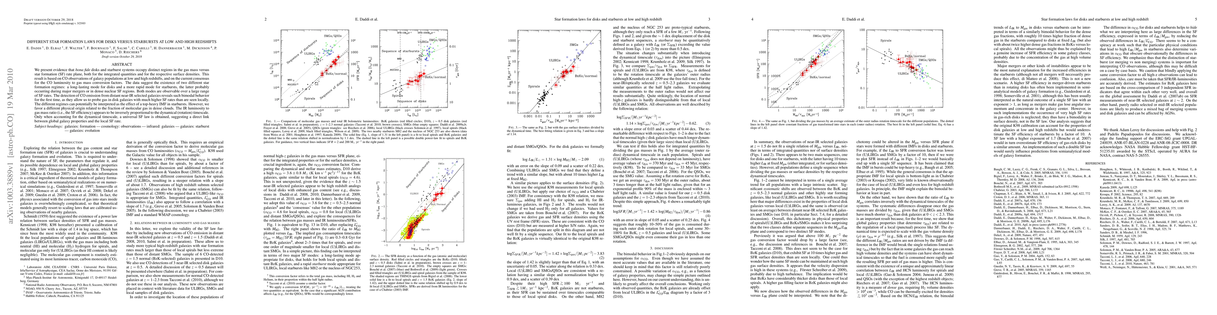 We present evidence that 'bona fide' disks and starburst systems occupy distinct regions in the gas mass versus star formation (SF) rate plane, both for the integrated quantities and for the respective surface densities. This result is based on CO observations of galaxy populations at low and high redshifts, and on the current consensus for the CO luminosity to gas mass conversion factors. The data suggest the existence of two different star formation regimes: a long-lasting mode for disks and a more rapid mode for starbursts, the latter probably occurring during major mergers or in dense nuclear SF regions. Both modes are observable over a large range of SF rates. The detection of CO emission from distant near-IR selected galaxies reveals such bimodal behavior for the first time, as they allow us to probe gas in disk galaxies with much higher SF rates than are seen locally. The different regimes can potentially be interpreted as the effect of a top-heavy IMF in starbursts. However, we favor a different physical origin related to the fraction of molecular gas in dense clouds. The IR luminosity to gas mass ratio (i.e., the SF efficiency) appears to be inversely proportional to the dynamical (rotation) timescale. Only when accounting for the dynamical timescale, a universal SF law is obtained, suggesting a direct link between global galaxy properties and the local SF rate.