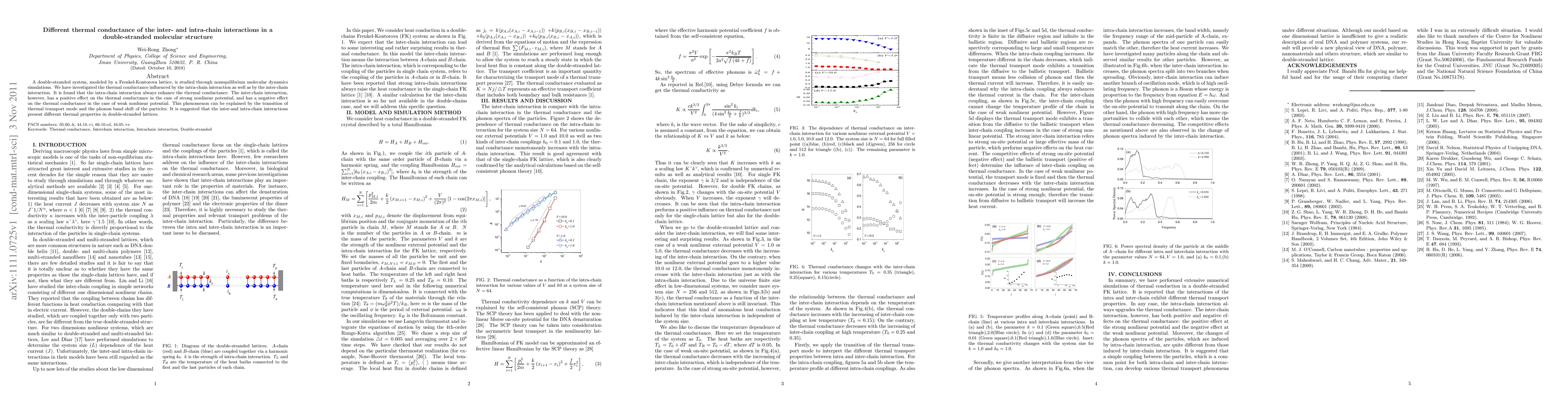 A double-stranded system, modeled by a Frenkel-Kontorova lattice, is studied through nonequilibrium molecular dynamics simulations. We have investigated the thermal conductance influenced by the intra-chain interaction as well as by the inter-chain interaction. It is found that the intra-chain interaction always enhance the thermal conductance. The inter-chain interaction, however, has a positive effect on the thermal conductance in the case of strong nonlinear potential, and has a negative effect on the thermal conductance in the case of weak nonlinear potential. This phenomenon can be explained by the transition of thermal transport mode and the phonon band shift of the particles. It is suggested that the inter-and intra-chain interactions present different thermal properties in double-stranded lattices.