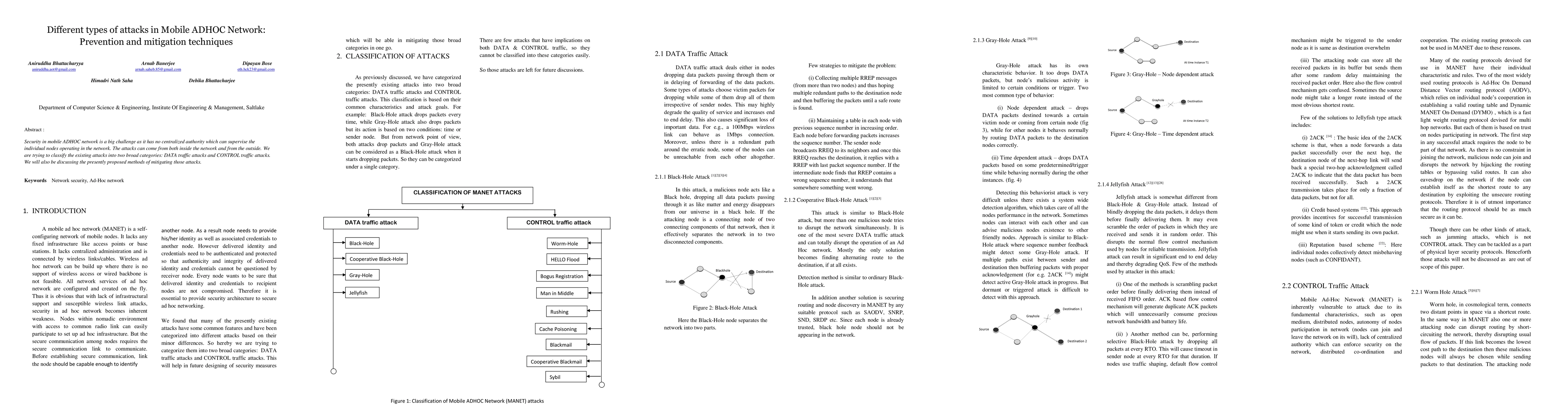 Security in mobile AD HOC network is a big challenge as it has no centralized authority which can supervise the individual nodes operating in the network. The attacks can come from both inside the network and from the outside. We are trying to classify the existing attacks into two broad categories: DATA traffic attacks and CONTROL traffic attacks. We will also be discussing the presently proposed methods of mitigating those attacks.