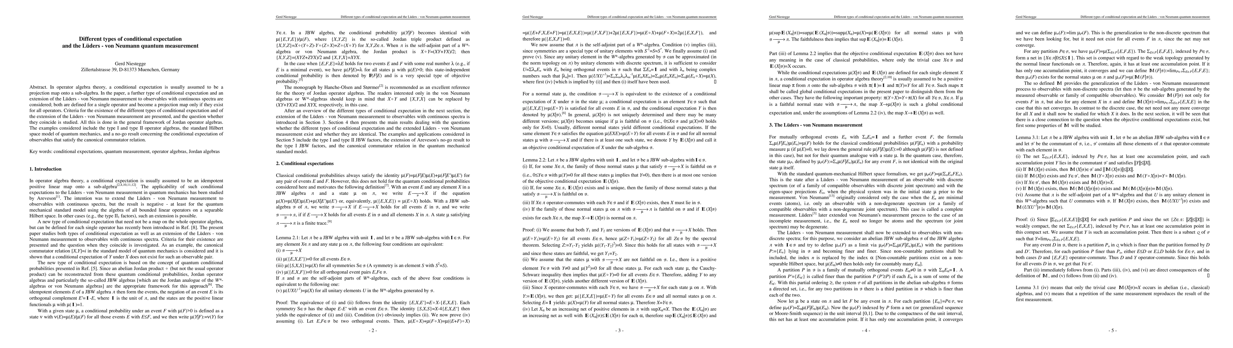 This paper explores various types of conditional expectations in operator algebra theory, extending the Lüders-von Neumann measurement to continuous spectra. It investigates criteria for their existence and examines whether these extensions coincide within the framework of Jordan operator algebras, including examples from quantum mechanics.
