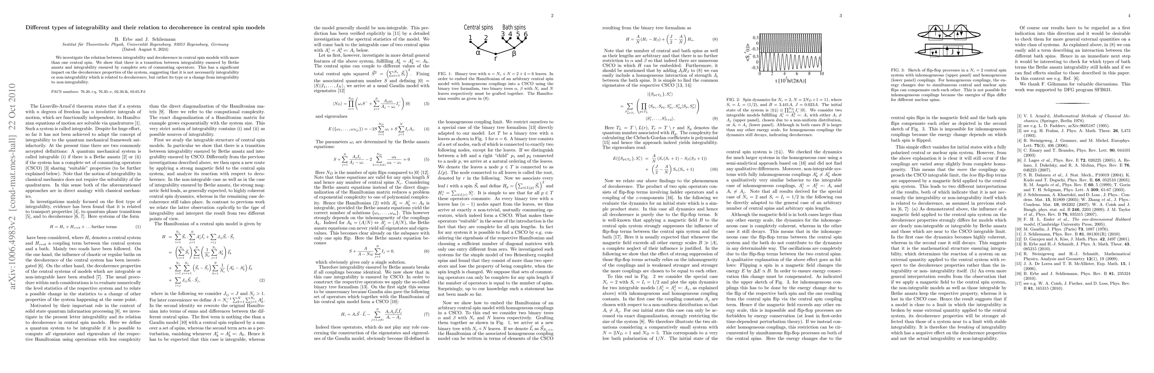 We investigate the relation between integrability and decoherence in central spin models with more than one central spin. We show that there is a transition between integrability ensured by the Bethe ansatz and integrability ensured by complete sets of commuting operators. This has a significant impact on the decoherence properties of the system, suggesting that it is not necessarily integrability or nonintegrability which is related to decoherence, but rather its type or a change from integrability to nonintegrability.