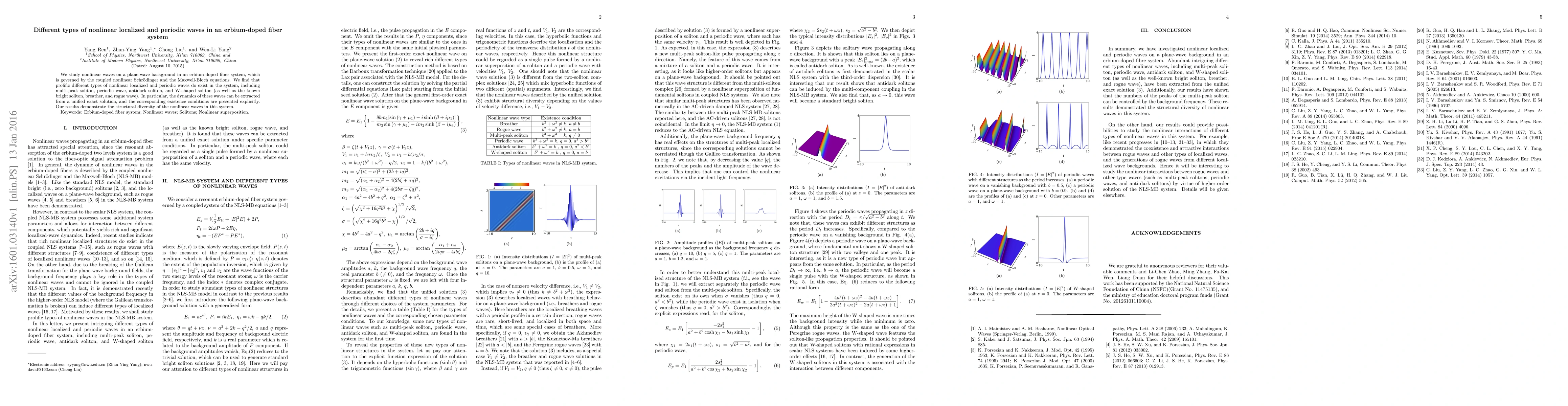 This paper investigates various nonlinear localized and periodic waves in an erbium-doped fiber system, governed by coupled nonlinear Schrödinger and Maxwell-Bloch equations. It identifies several types of waves, including multi-peak soliton, periodic wave, antidark soliton, and W-shaped soliton, alongside known bright soliton, breather, and rogue wave, all derived from a unified exact solution.