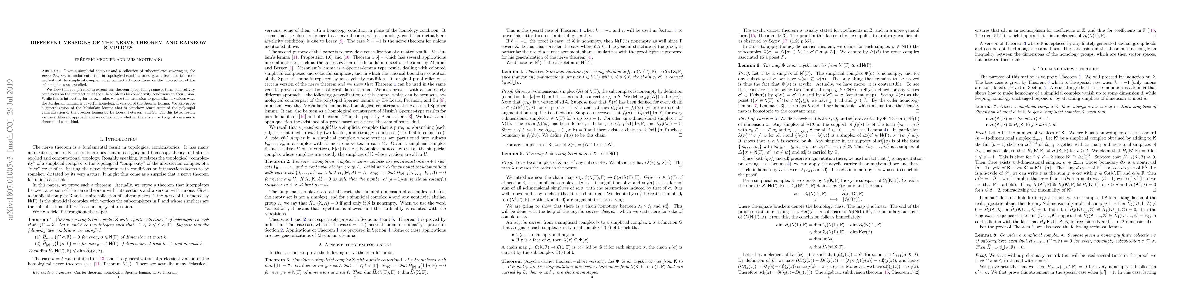 Given a simplicial complex and a collection of subcomplexes covering it, the nerve theorem, a fundamental tool in topological combinatorics, guarantees a certain connectivity of the simplicial complex when connectivity conditions on the intersection of the subcomplexes are satisfied. We show that it is possible to extend this theorem by replacing some of these connectivity conditions on the intersection of the subcomplexes by connectivity conditions on their union. While this is interesting for its own sake, we use this extension to generalize in various ways the Meshulam lemma, a powerful homological version of the Sperner lemma. We also prove a generalization of the Meshulam lemma that is somehow reminiscent of the polytopal generalization of the Sperner lemma by De Loera, Peterson, and Su. For this latter result, we use a different approach and we do not know whether there is a way to get it via a nerve theorem of some kind.