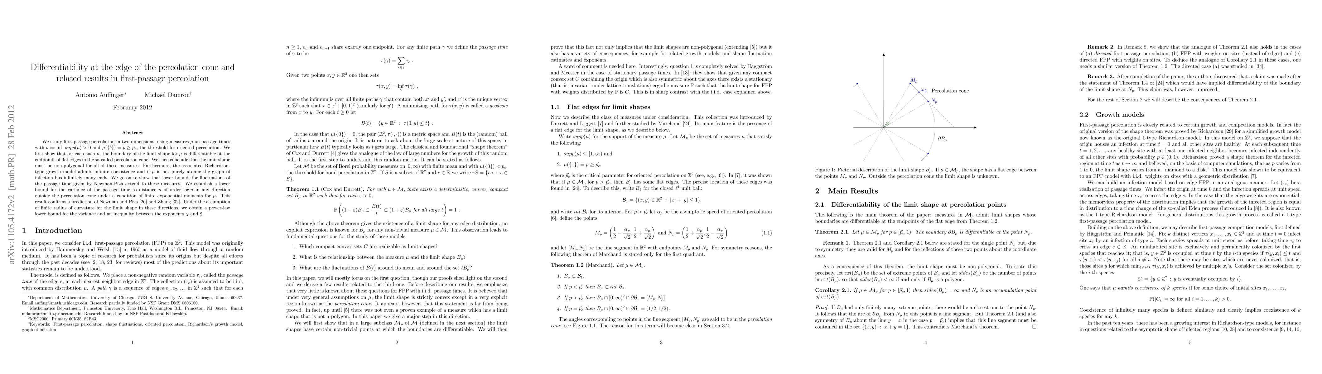 This paper explores first-passage percolation in two dimensions, demonstrating differentiability at the edges of the percolation cone and proving non-polygonality of the limit shape. It also establishes infinite coexistence in the associated growth model and provides lower bounds for passage time fluctuations and variance.