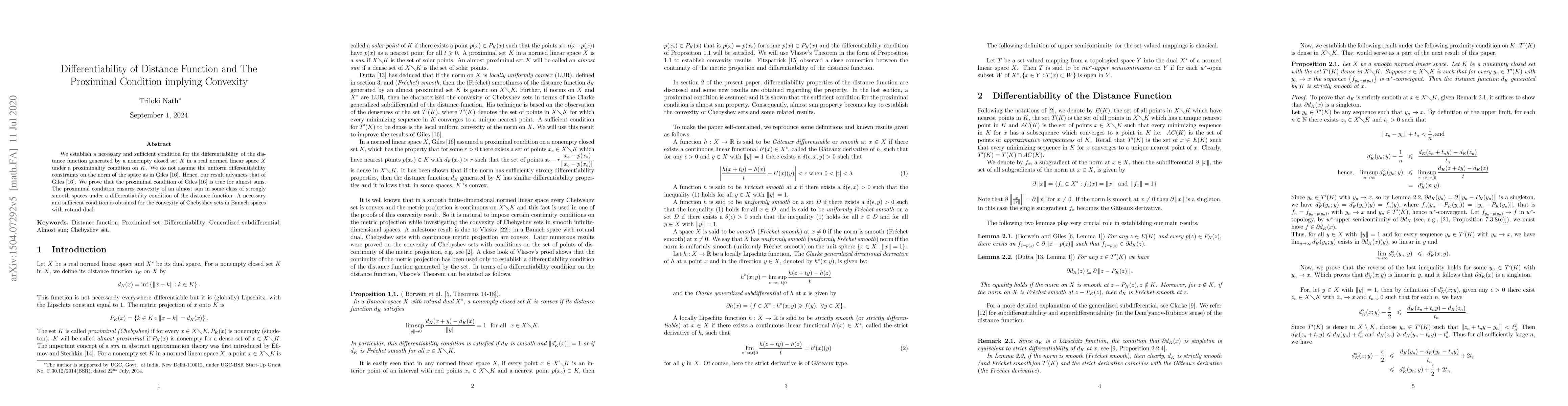 We establish a necessary and sufficient condition for the differentiability of the distance function generated by a nonempty closed set K in a real normed linear space X under a proximinality condition on K. We do not assume the uniform differentiability constraints on the norm of the space as in Giles [16]. Hence, our result advances that of Giles [16]. We prove that the proximinal condition of Giles [16] is true for almost suns. The proximinal condition ensures convexity of an almost sun in some class of strongly smooth spaces under a differentiability condition of the distance function. A necessary and sufficient condition is obtained for the convexity of Chebyshev sets in Banach spaces with rotund dual.