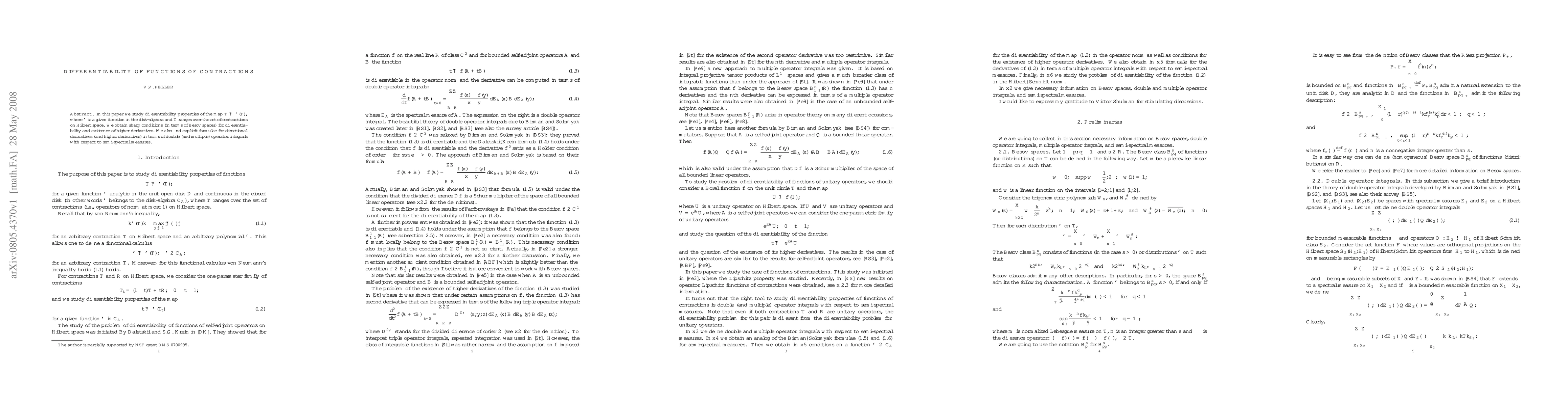 In this paper we study differentiability properties of the map $T\mapsto\phi(T)$, where $\phi$ is a given function in the disk-algebra and $T$ ranges over the set of contractions on Hilbert space. We obtain sharp conditions (in terms of Besov spaces) for differentiability and existence of higher derivatives. We also find explicit formulae for directional derivatives (and higher derivatives) in terms of double (and multiple) operator integrals with respect to semi-spectral measures.
