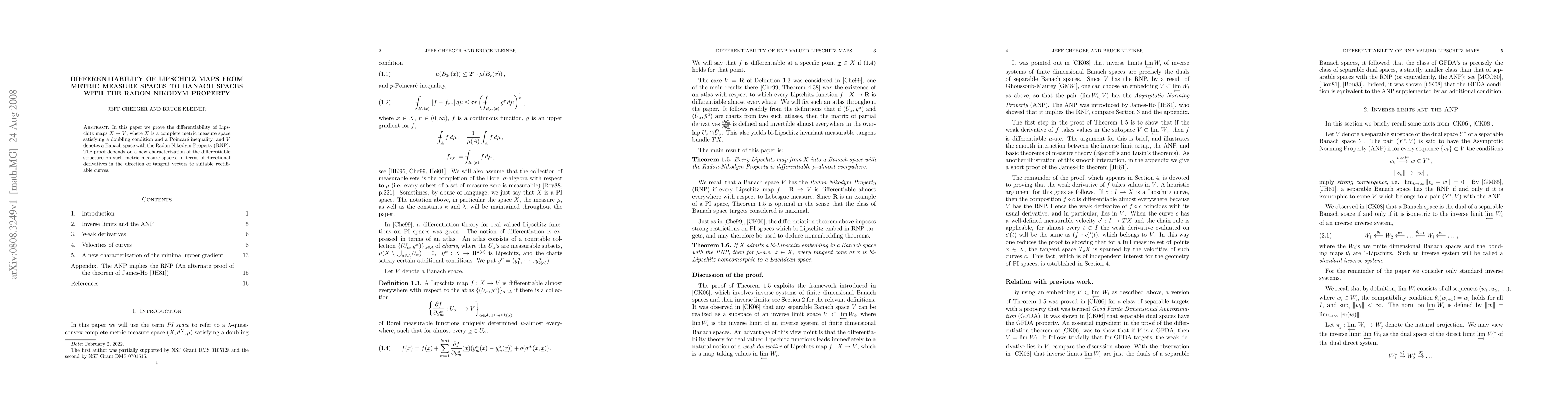 We prove the differentiability of Lipschitz maps X-->V, where X is a complete metric measure space satisfying a doubling condition and a Poincar\'e inequality, and V is a Banach space with the Radon Nikodym Property (RNP). The proof depends on a new characterization of the differentiable structure on such metric measure spaces, in terms of directional derivatives in the direction of tangent vectors to suitable rectifiable curves.