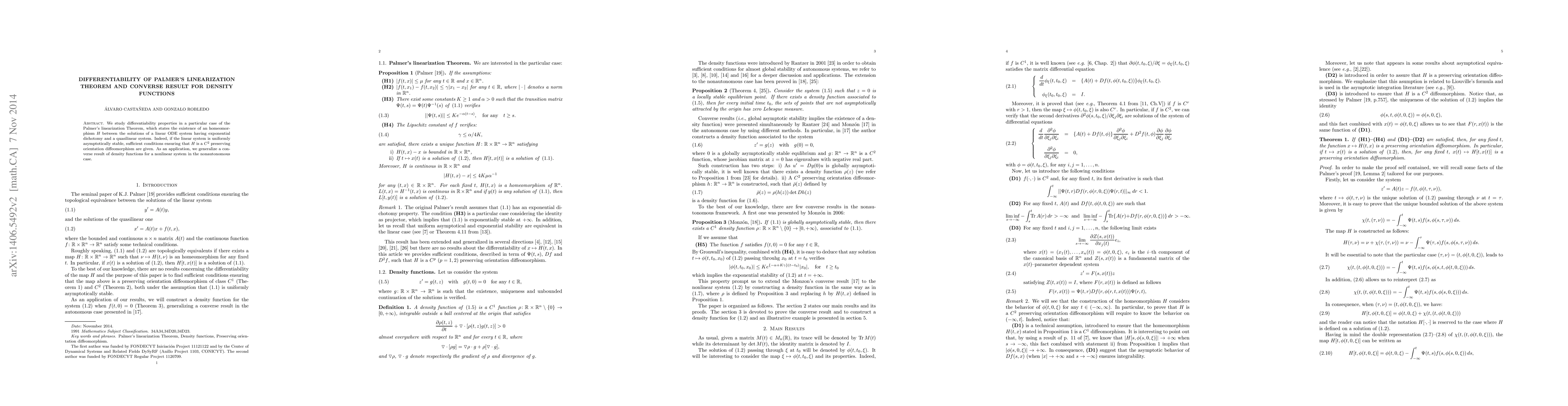 We study differentiability properties in a particular case of the Palmer's linearization Theorem, which states the existence of an homeomorphism $H$ between the solutions of a linear ODE system having exponential dichotomy and a quasilinear system. Indeed, if the linear system is uniformly asymptotically stable, sufficient conditions ensuring that $H$ is a $C^{2}$ preserving orientation diffeomorphism are given. As an application, we generalize a converse result of density functions for a nonlinear system in the nonautonomous case.