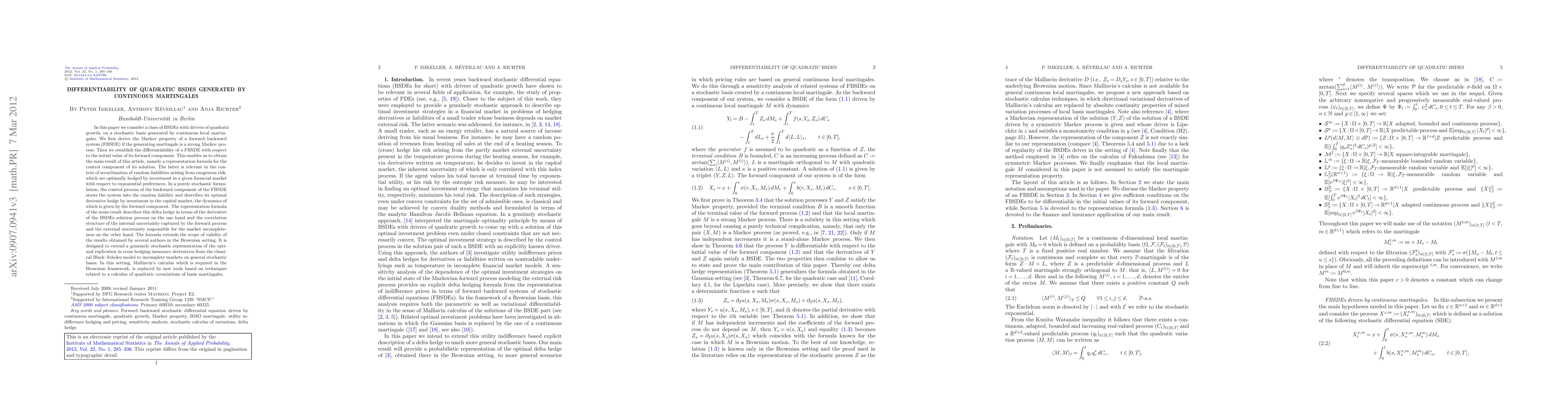 This paper explores the differentiability of quadratic BSDEs driven by continuous local martingales, establishing a Markov property for forward-backward systems. It derives a representation formula for the control component of the solution, relevant for hedging random liabilities under exponential preferences in financial markets.