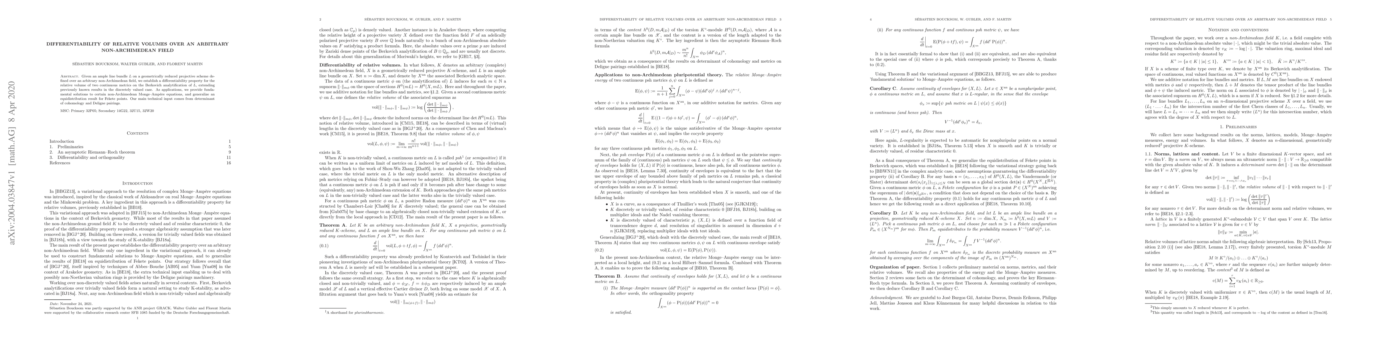 Summary: This paper establishes differentiability for relative volumes of line bundles over non-Archimedean fields, extending discretely valued results, and applies these findings to solve non-Archimedean Monge-Ampère equations and generalize equidistribution results for Fekete points. The study leverages determinant of cohomology and Deligne pairings.