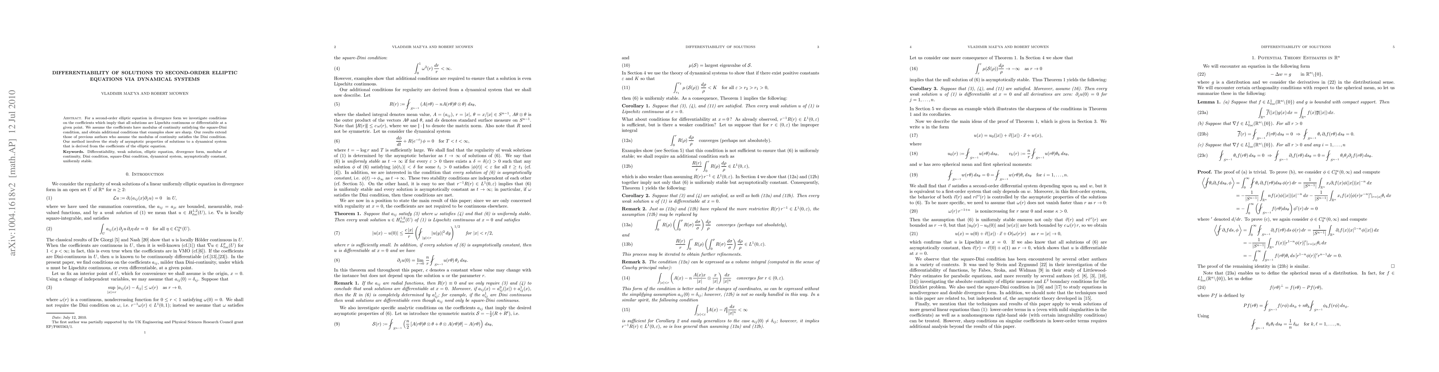 For a second-order elliptic equation in divergence form we investigate conditions on the coefficients which imply that all solutions are Lipschitz continuous or differentiable at a given point. We assume the coefficients have modulus of continuity satisfying the square-Dini condition, and obtain additional conditions that examples show are sharp. Our results extend those of previous authors who assume the modulus of continuity satisfies the Dini condition. Our method involves the study of asymptotic properties of solutions to a dynamical system that is derived from the coefficients of the elliptic equation.