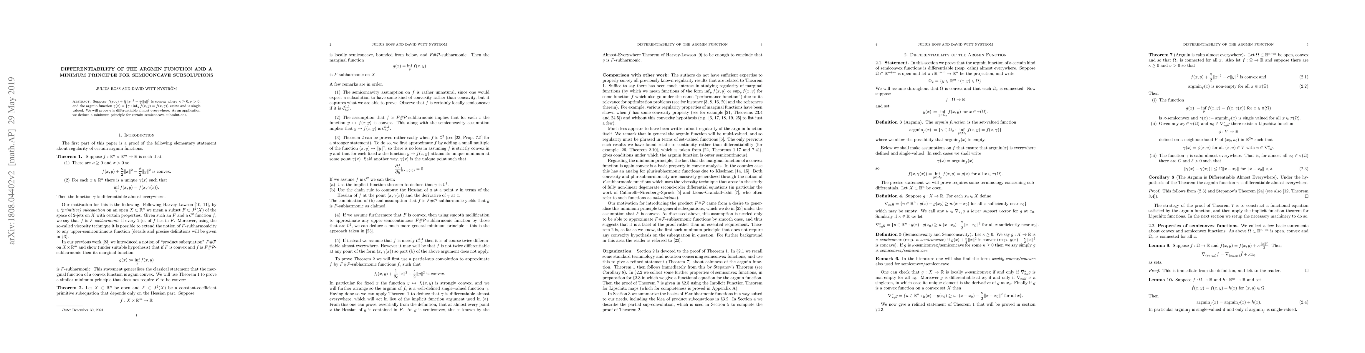 This paper proves that the argmin function, under certain convexity conditions, is differentiable almost everywhere. It also applies this result to establish a minimum principle for specific semiconcave subsolutions.