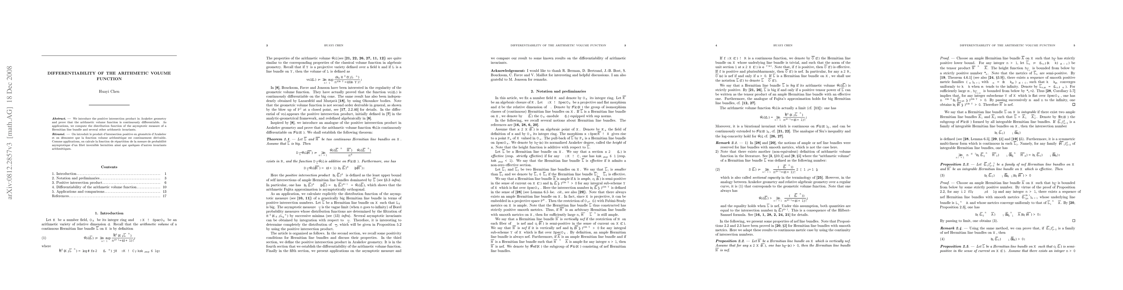 Summary: The paper introduces a positive intersection product in Arakelov geometry and demonstrates the continuous differentiability of the arithmetic volume function, while also computing the distribution function of the asymptotic measure of a Hermitian line bundle and other arithmetic invariants.