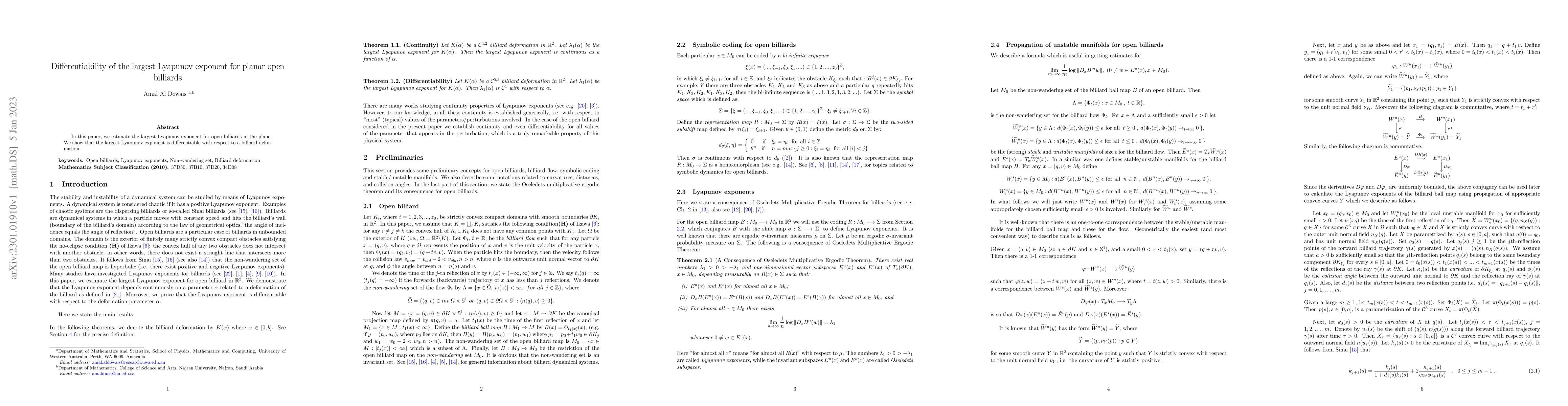 Summary: This paper estimates the largest Lyapunov exponent for planar open billiards and demonstrates its differentiability concerning billiard deformations, providing insights into the dynamical behavior of these systems.