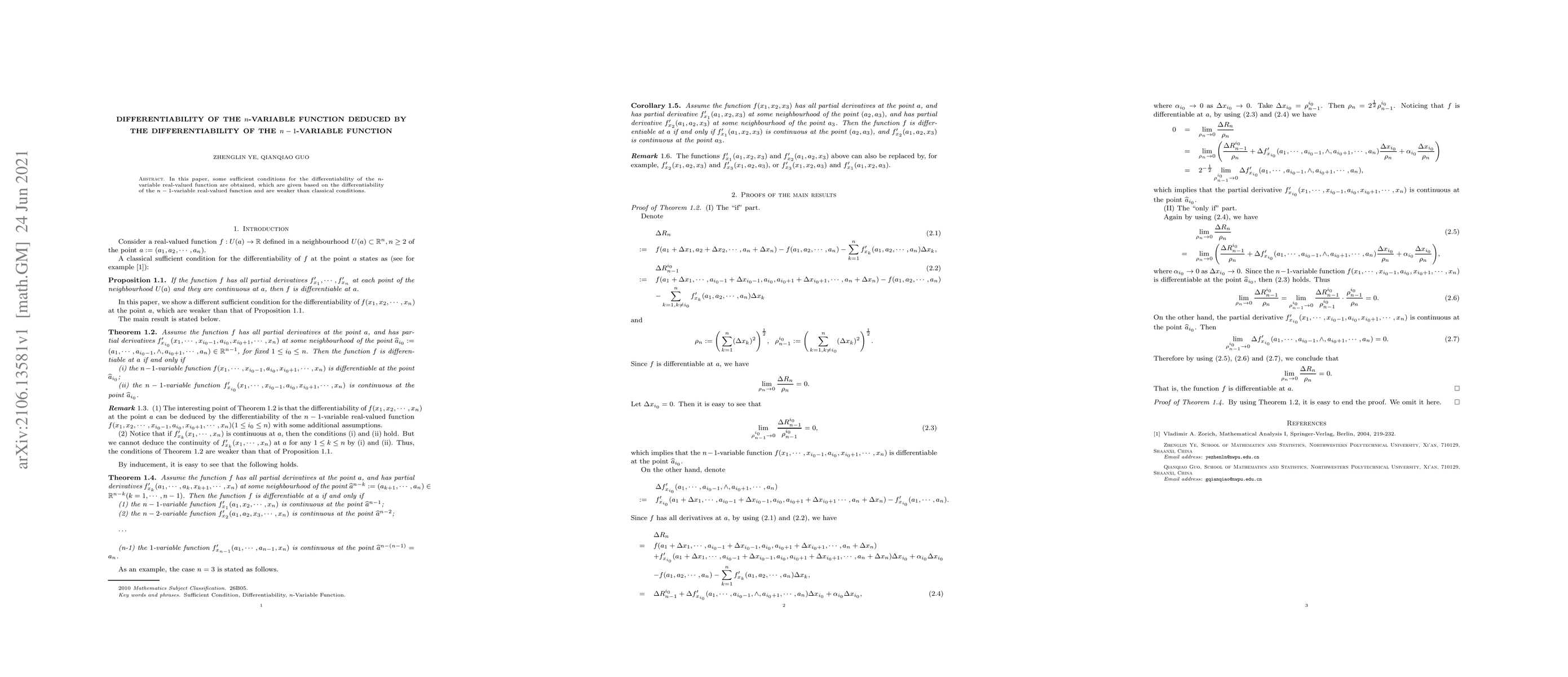 In this paper, some sufficient conditions for the differentiability of the $n$-variable real-valued function are obtained, which are given based on the differentiability of the $n-1$-variable real-valued function and are weaker than classical conditions.