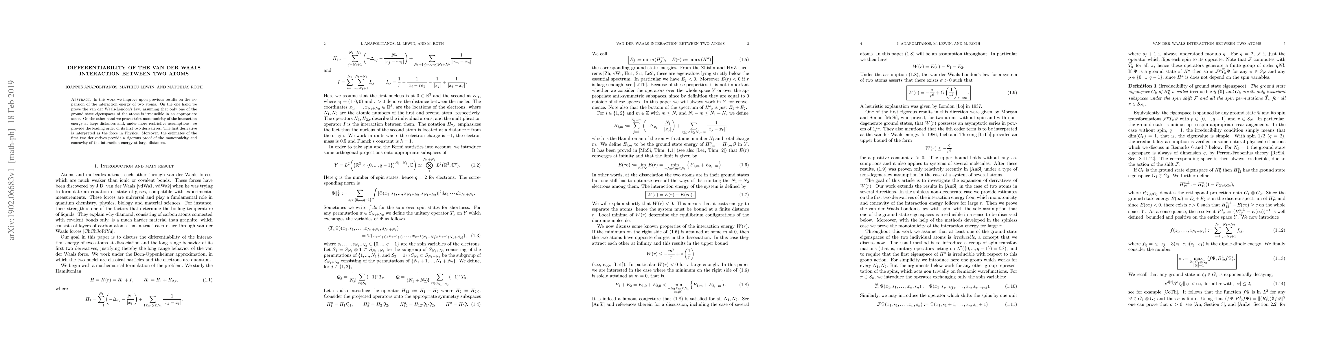 In this work we improve upon previous results on the expansion of the interaction energy of two atoms. On the one hand we prove the van der Waals-London's law, assuming that only one of the ground state eigenspaces of the atoms is irreducible in an appropriate sense. On the other hand we prove strict monotonicity of the interaction energy at large distances and, under more restrictive assumptions, we provide the leading order of its first two derivatives. The first derivative is interpreted as the force in Physics. Moreover, the estimates of the first two derivatives provide a rigorous proof of the monotonicity and concavity of the interaction energy at large distances.