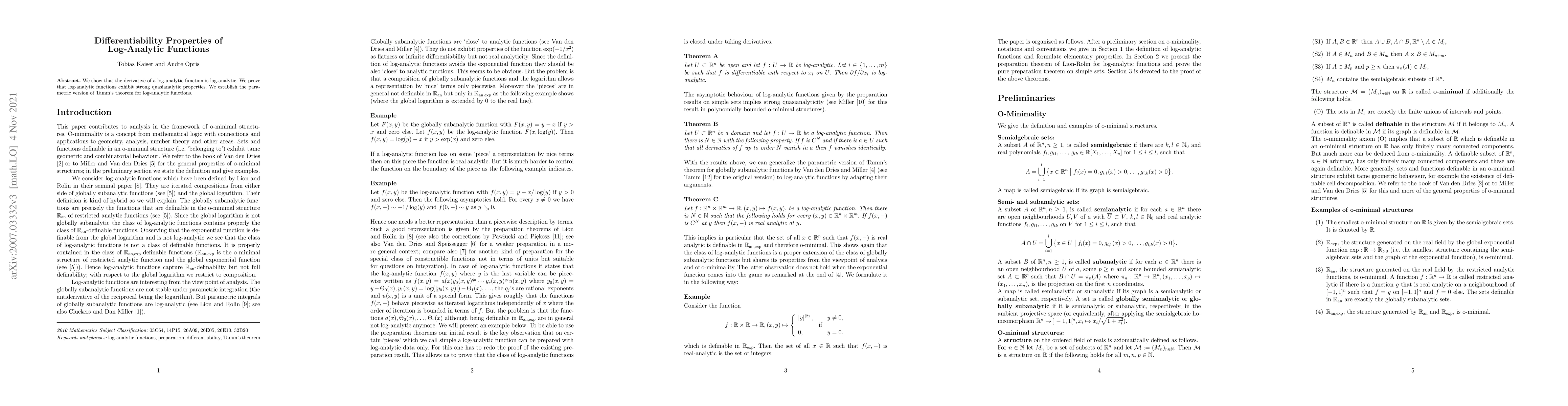 We show that the derivative of a log-analytic function is log-analytic. We prove that log-analytic functions exhibit strong quasianalytic properties. We establish the parametric version of Tamm's theorem for log-analytic functions.