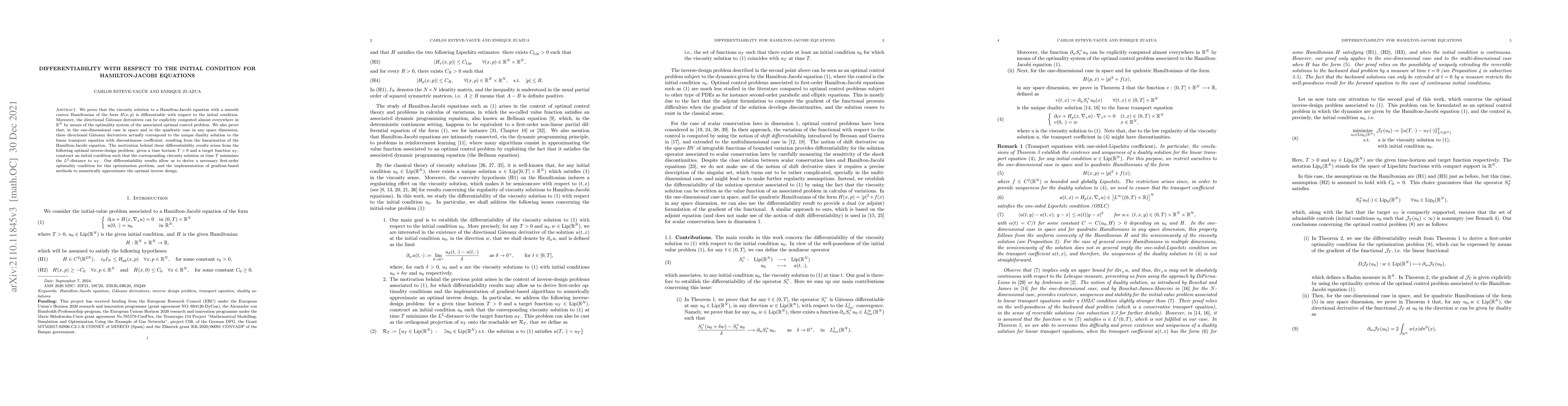 This paper proves the differentiability of viscosity solutions to Hamilton-Jacobi equations with respect to initial conditions, providing explicit formulas for the directional Gâteaux derivatives. These results facilitate the optimization of inverse design problems by enabling gradient-based numerical methods.