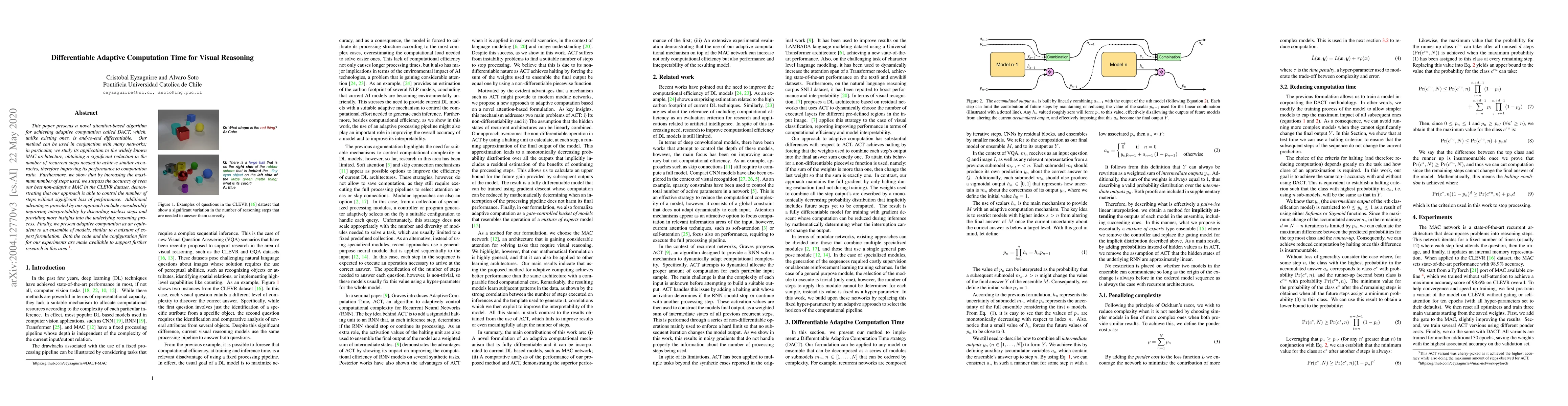 The paper introduces DACT, a differentiable adaptive computation method enhancing various networks, particularly the MAC architecture. DACT significantly reduces recurrent steps for similar accuracies, improving performance-computation ratio. It surpasses non-adaptive MAC accuracy on CLEVR dataset, offers improved interpretability by eliminating useless steps, and presents adaptive computation as an ensemble of models.