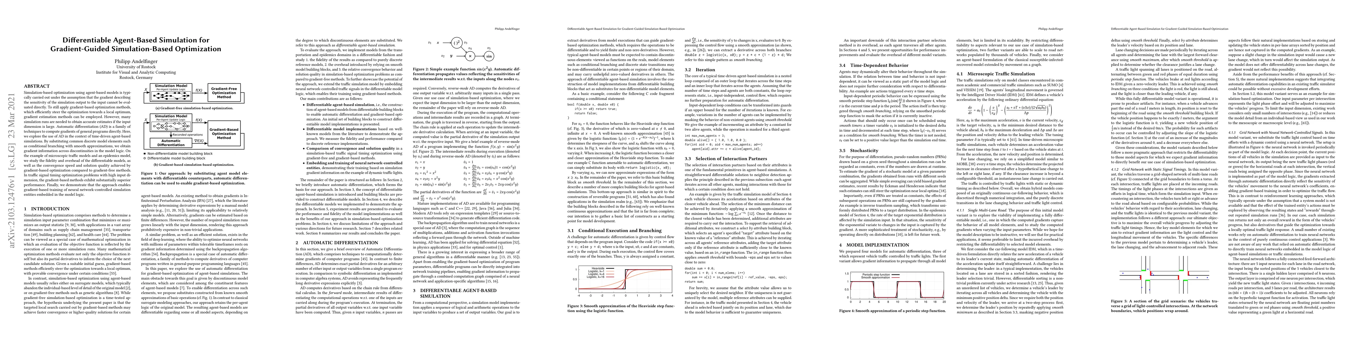 This paper explores the application of automatic differentiation in agent-based simulations to enable gradient-guided optimization, demonstrating superior performance in high-dimensional traffic signal optimization compared to gradient-free methods. The approach also allows for gradient-based training of neural networks within the simulation.